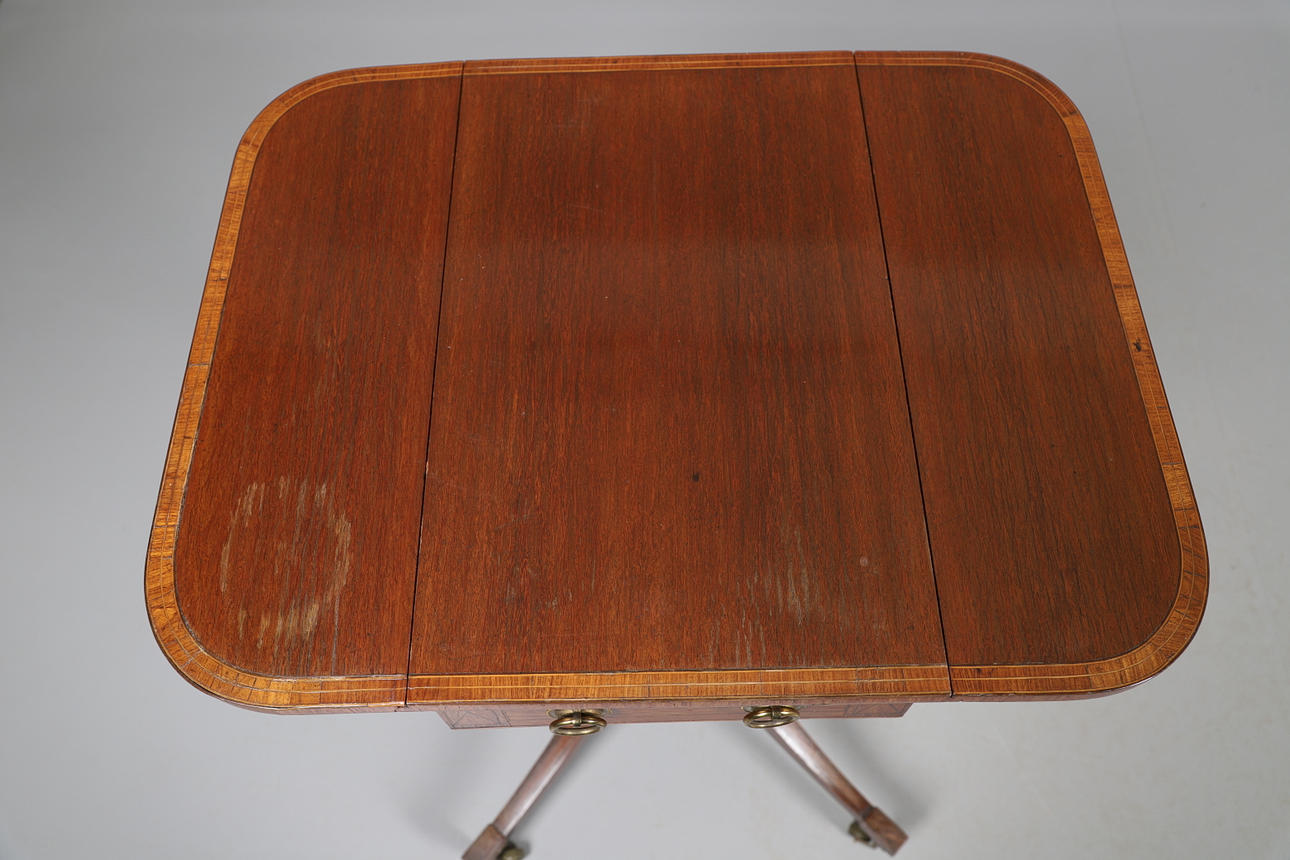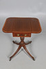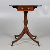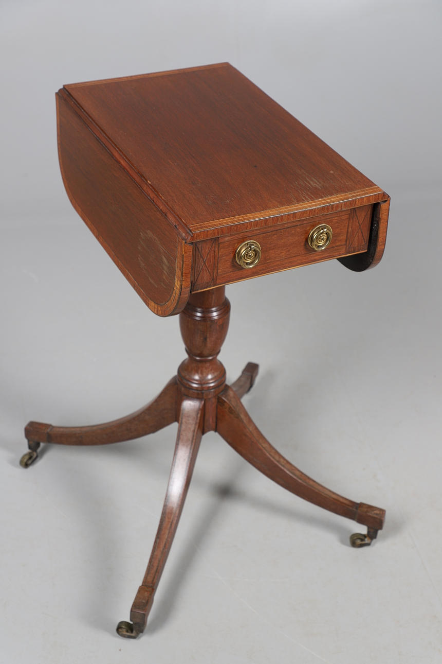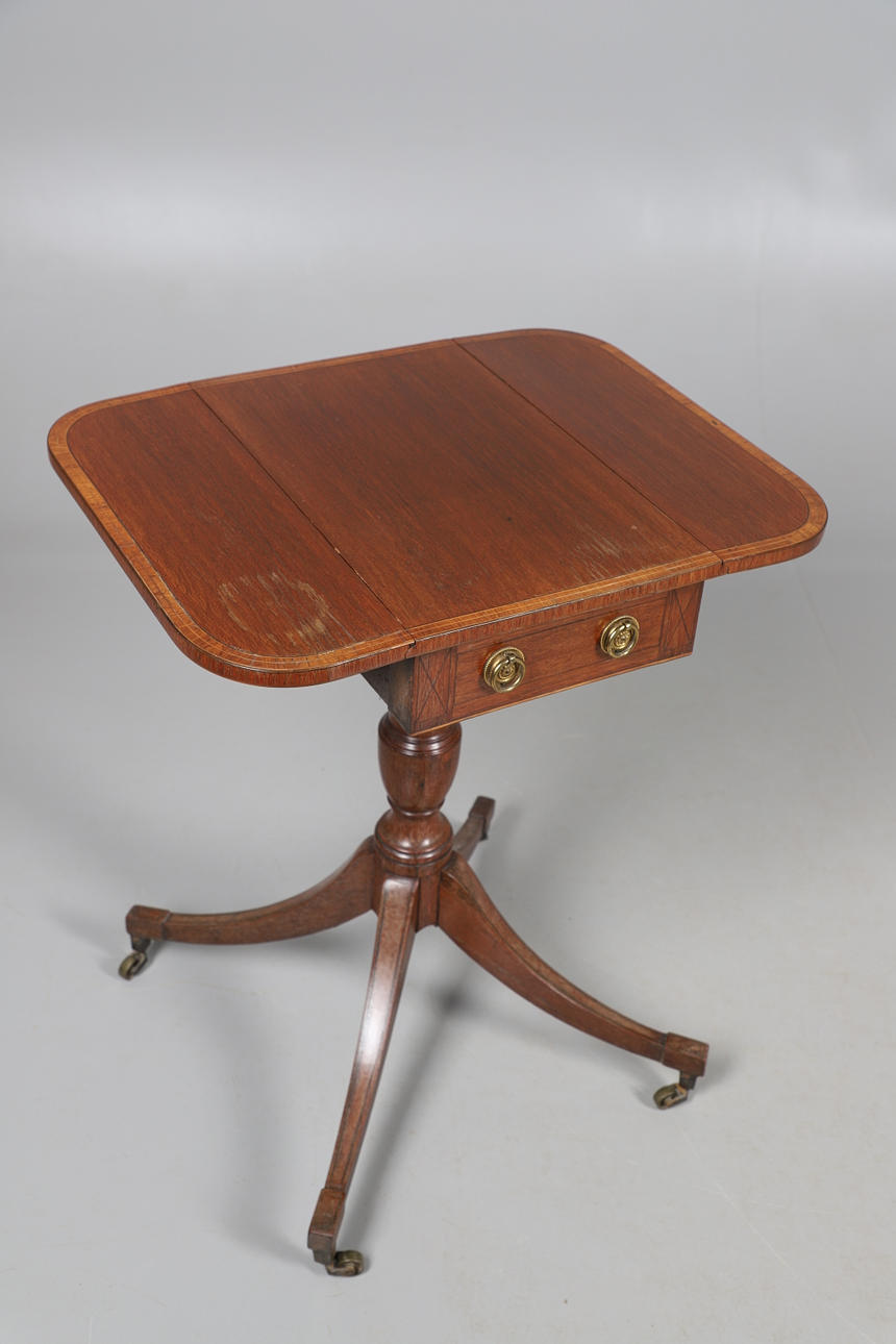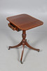 the rectangular top with two flaps over a frieze drawer, all raised on a central column with splayed legs and castors, 30cm (59cm flaps up) x 46cm x 73cm.