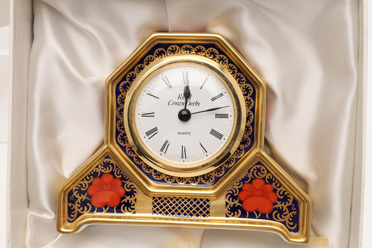 A small Old Imari mantle clock by Royal Crown Derby, with a quartz movement. Model No 1128 and in it's original box. Clock 10.5cms high.