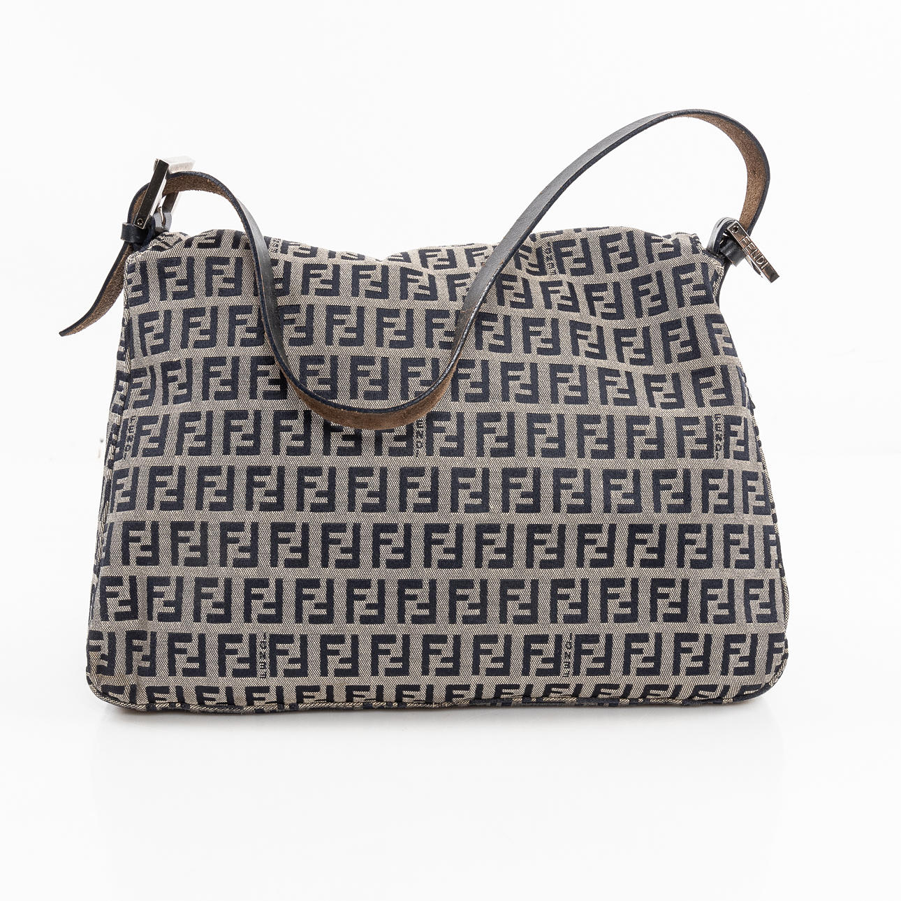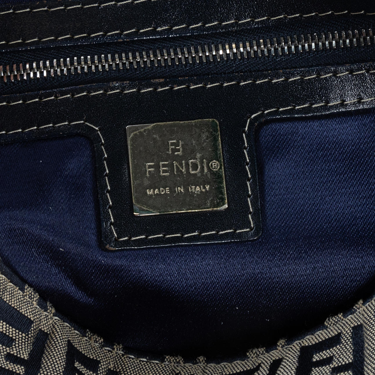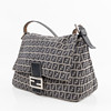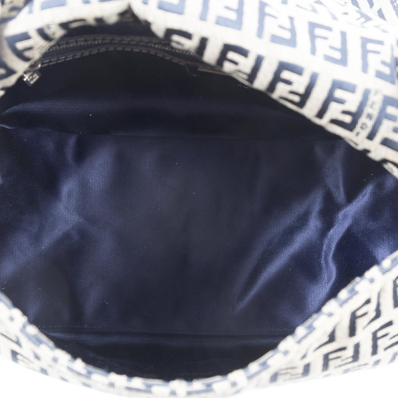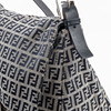 in monogrammed beige/blue “Zucchino” textile with navy blue leather shoulder strap and metal buckle. Interior in black textile with a zippered compartment. Tagged FENDI MADE IN ITALY.