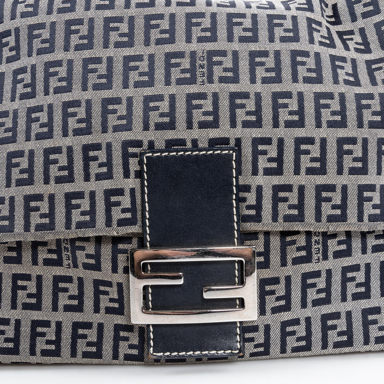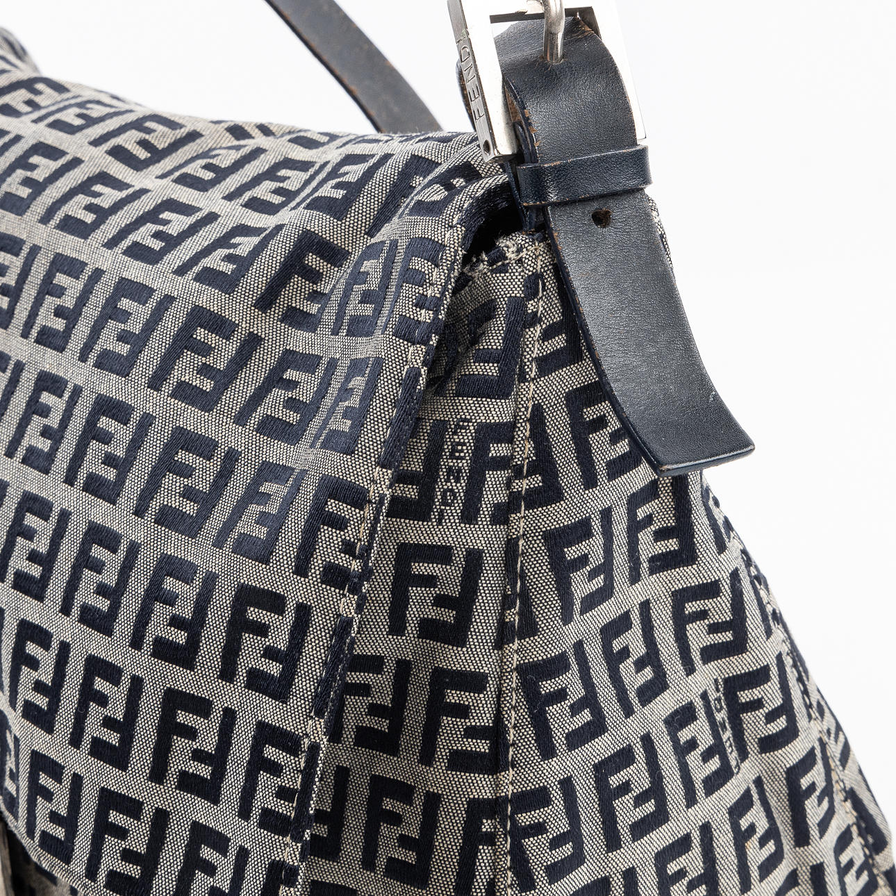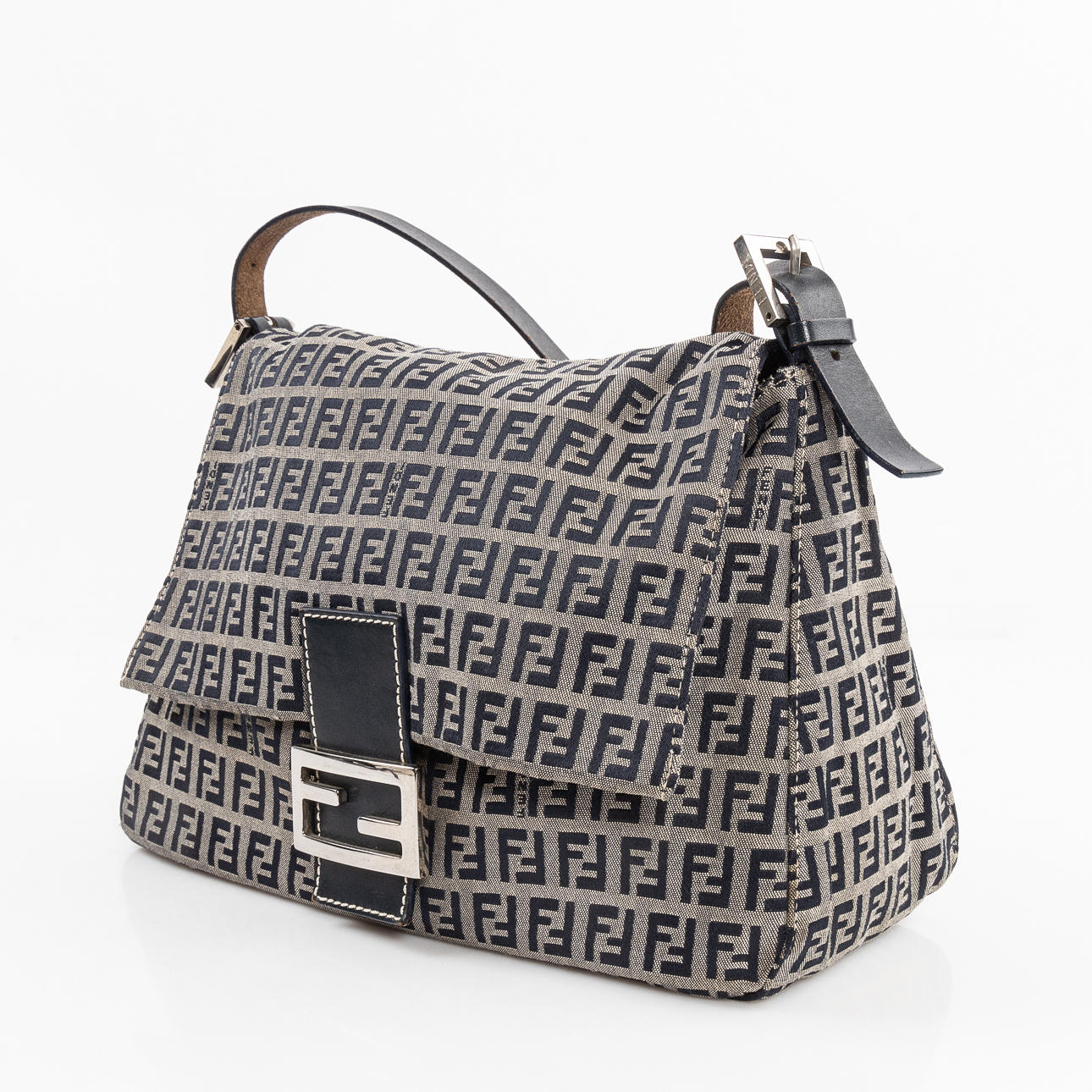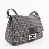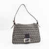 in monogrammed beige/blue “Zucchino” textile with navy blue leather shoulder strap and metal buckle. Interior in black textile with a zippered compartment. Tagged FENDI MADE IN ITALY.