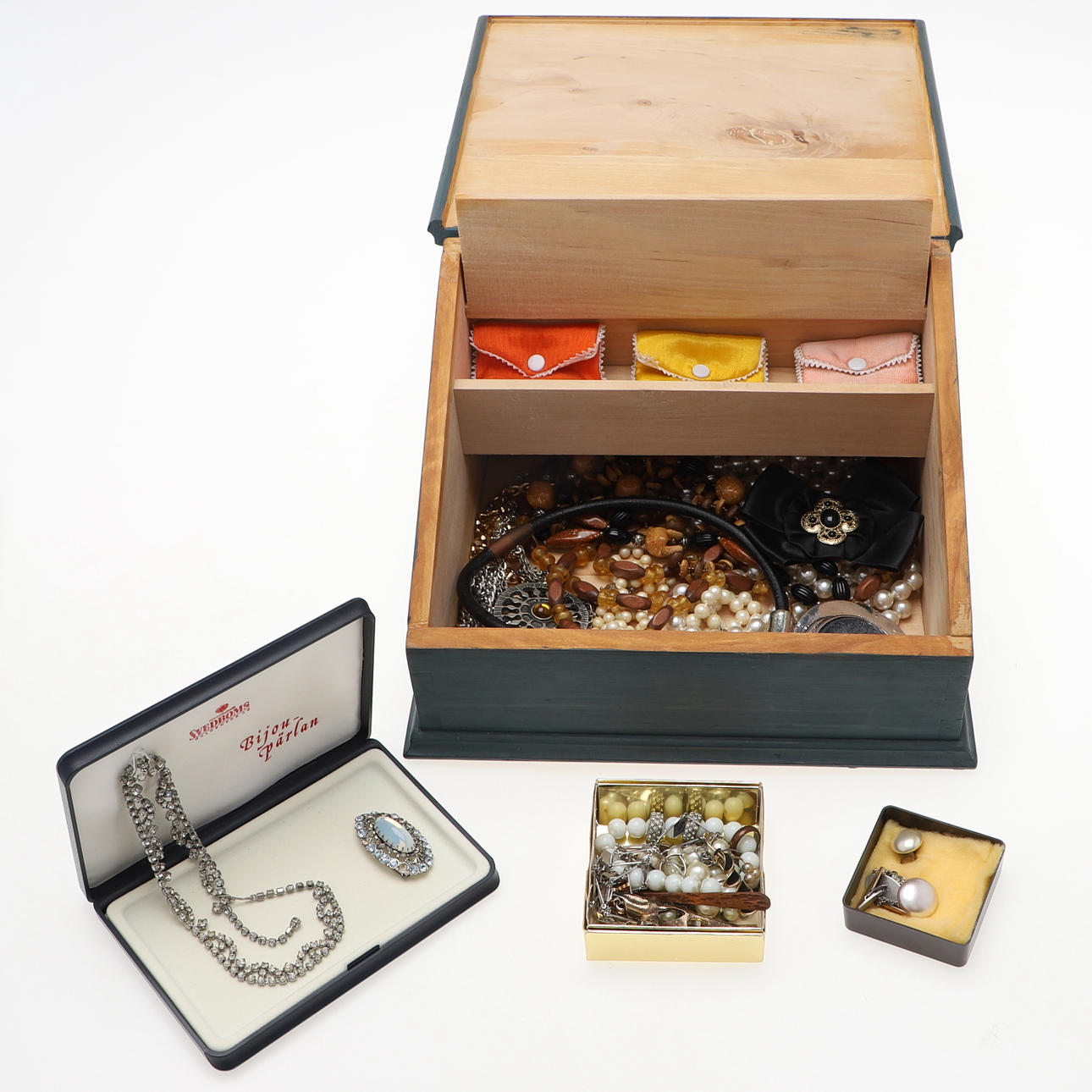 Jewellery box in painted wood, dimensions approx. 22x18x29 cm Collected bijouterie; necklaces, earrings, cufflinks, brooches etc.