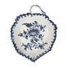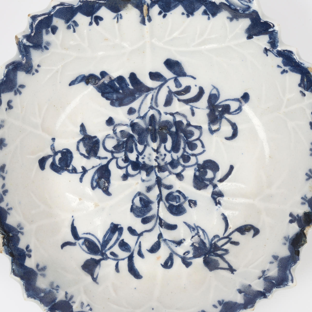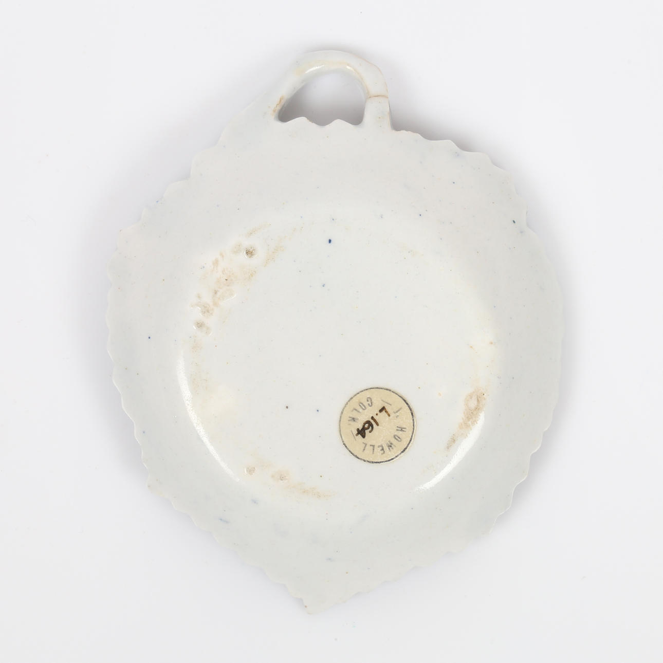 of veined moulded leaf form with loop handle and underglaze blue foliate decoration, 9.5cm wide,