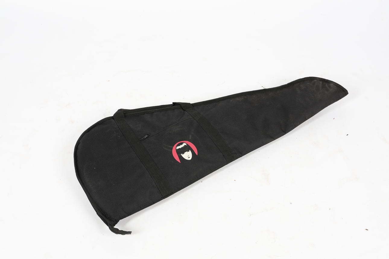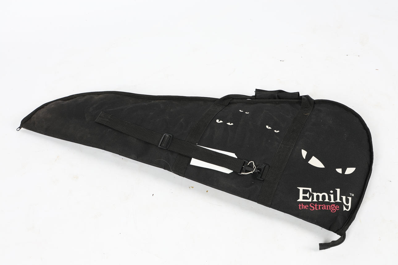 The 'SG' style electric guitar with soft case and strap, all with Emily The Strange decoration, serial number SJ06083018, 100cm length.