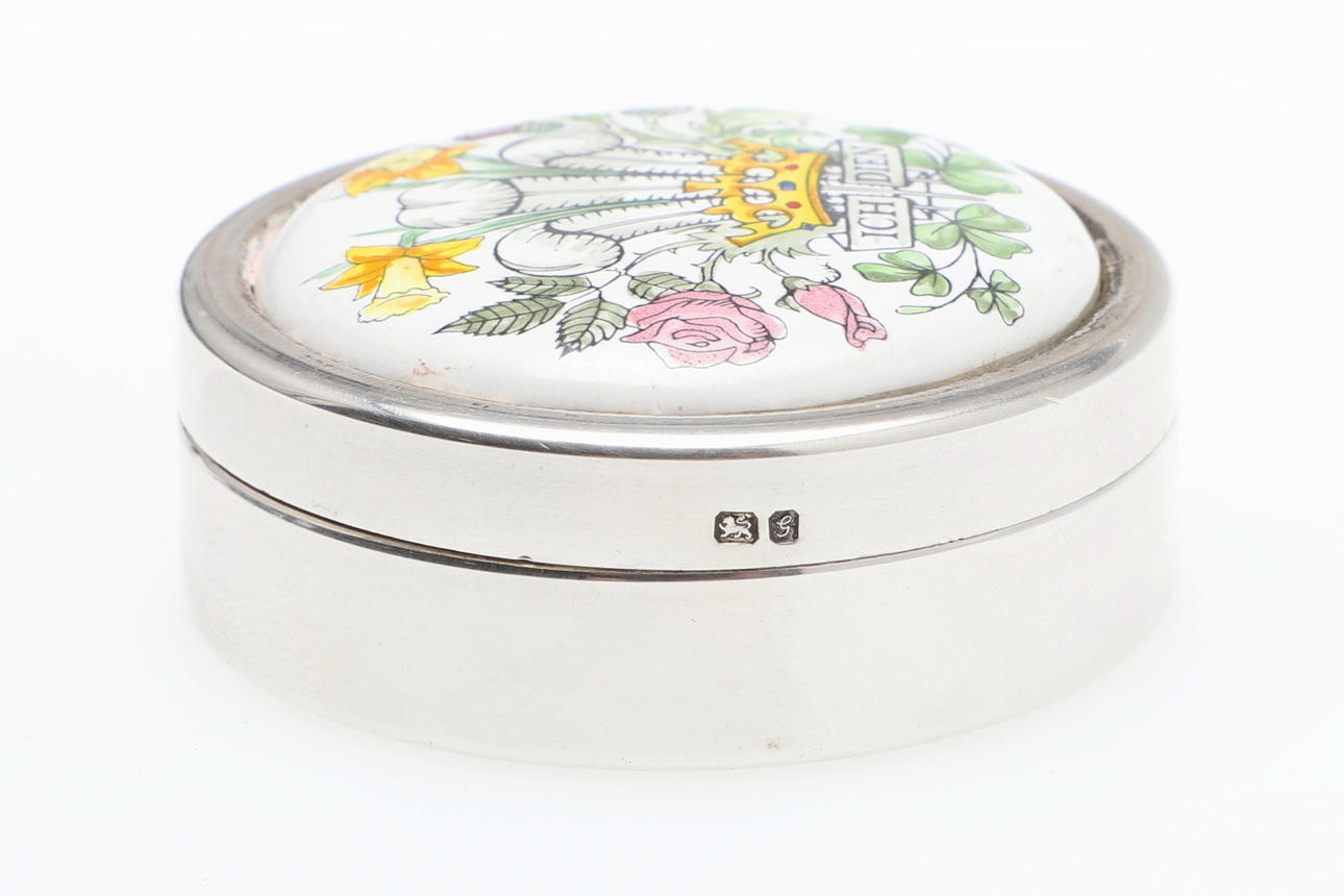 AN ELIZABETH II SILVER & ENAMEL BOX & COVER.