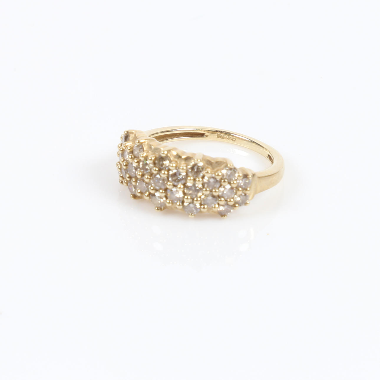 Twenty-seven round champagne coloured Argyle diamond, TDW 1.00ct.Colour C4. Clarity I1-2. Yellow gold, hallmarked 'G, 375, Birmingham, 2021'. Finger size J.5. Weight 3g