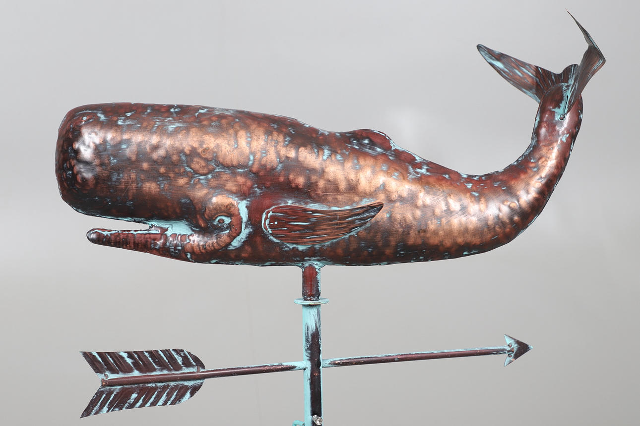 Topped with a copper figure of a whale, comes with instructions and some spare screws/tools. Height 82cm x Diameter at widest point 61cm.