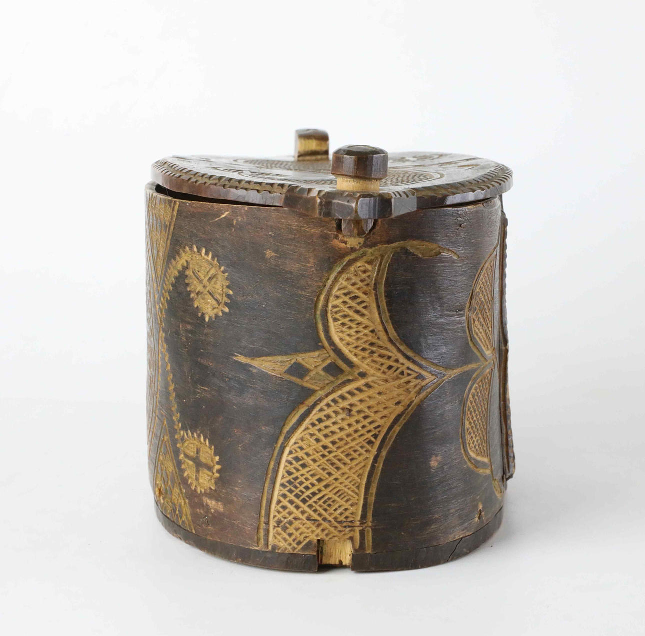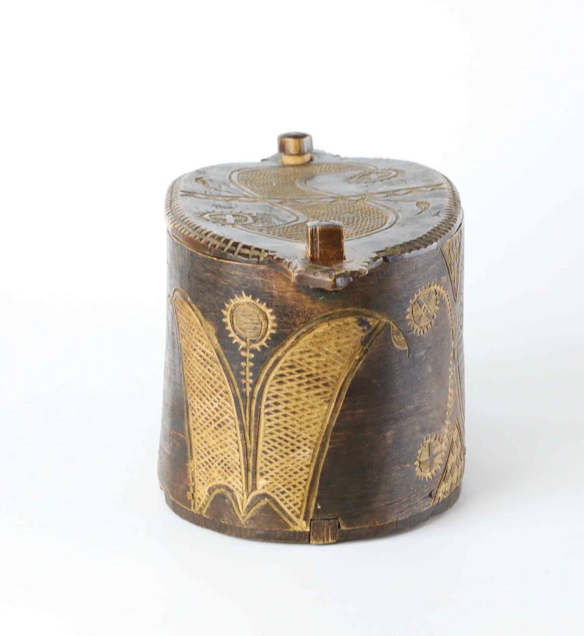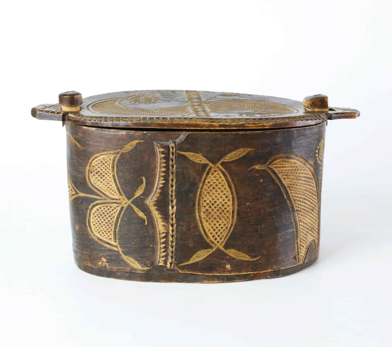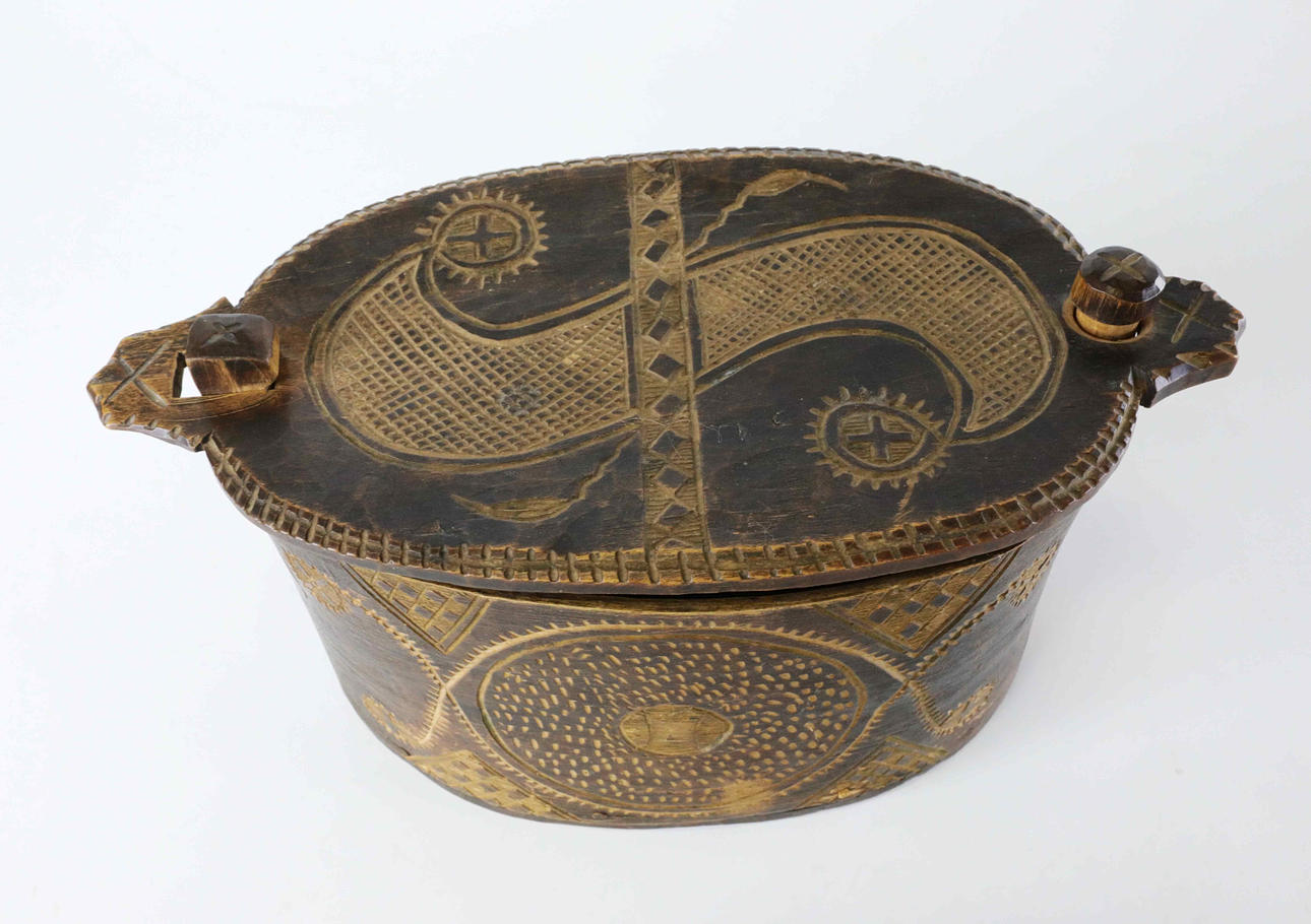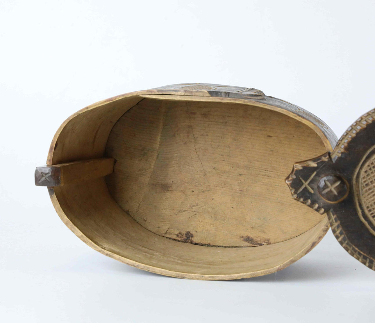 Cut decor, cover opens sideways. Height 13 cm Length approx. 27 cm.