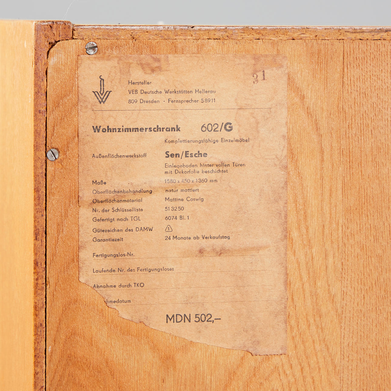 Varnished ash wood veneer construction with: