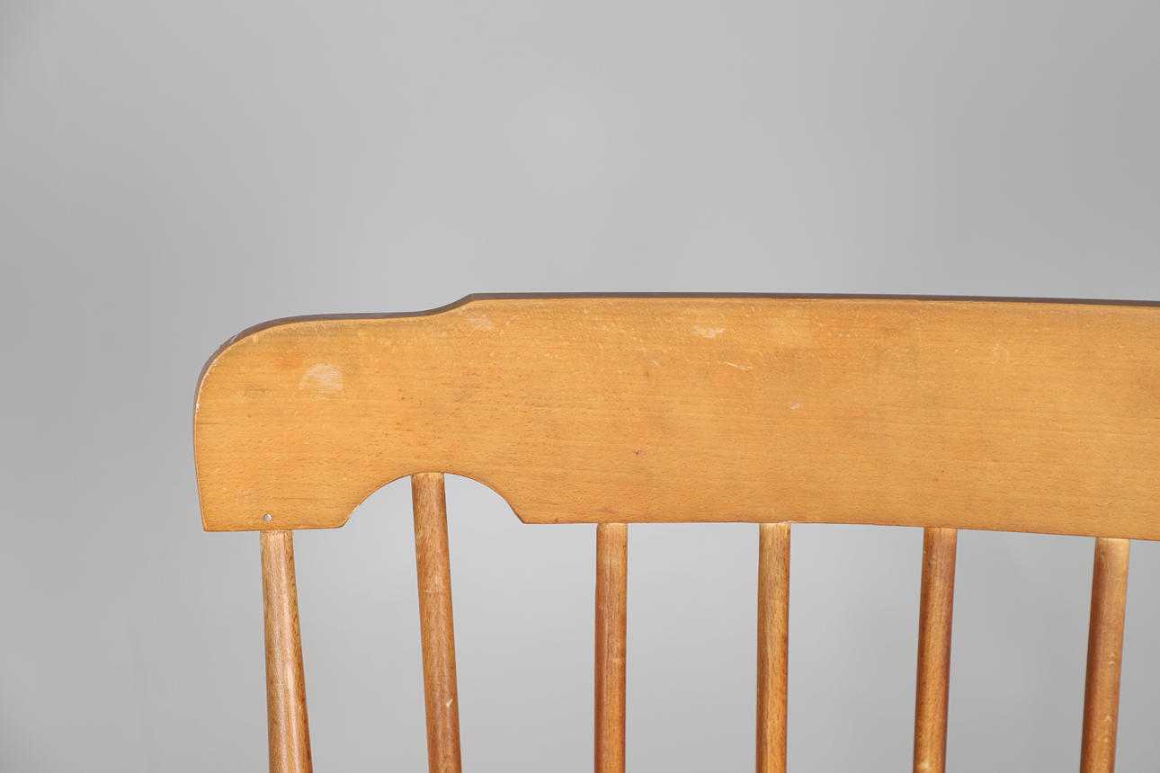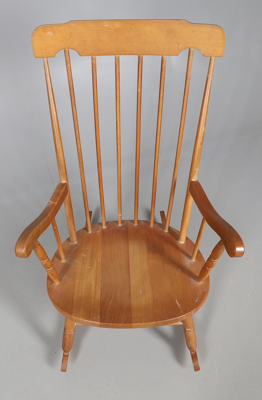 A MODERN OAK STICK BACK ROCKING CHAIR.
