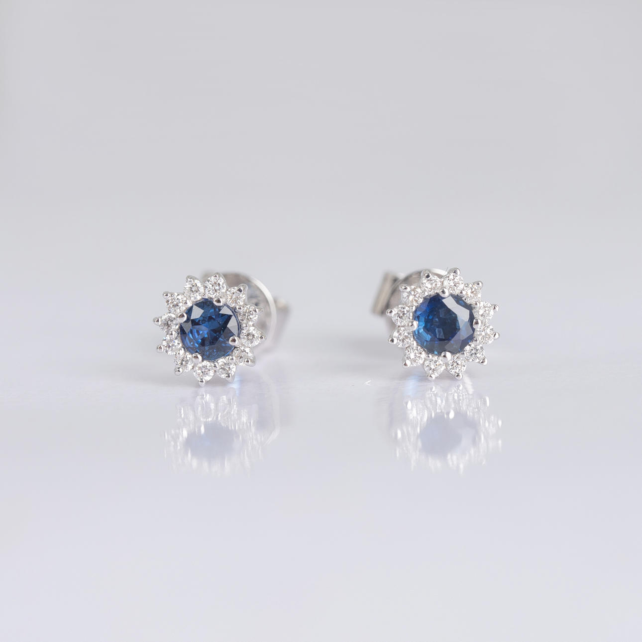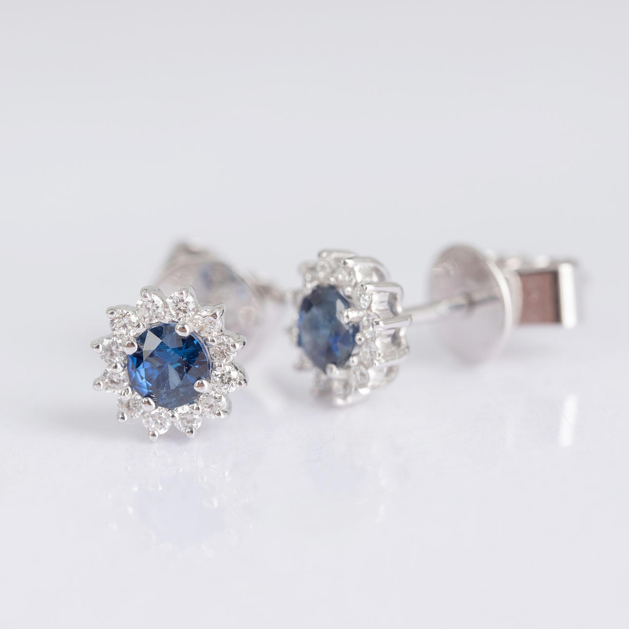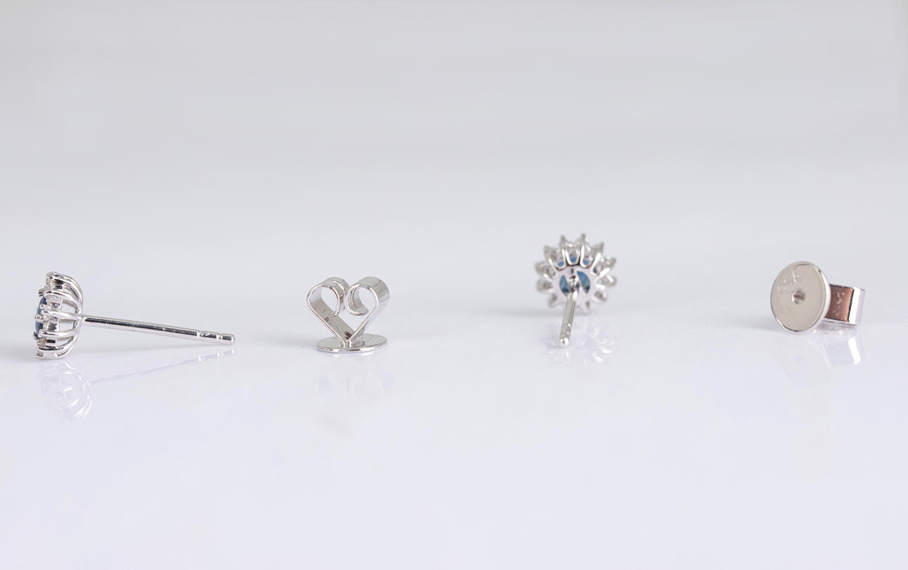 Earrings made of 750 gold, each set with a sapphire of approx. 0.41 ct together and a total of diamonds of ca. 0.17 ct. Sapphire dimensions diameter approx. 3.5 mm Total weight approx. 1.7 grams.
