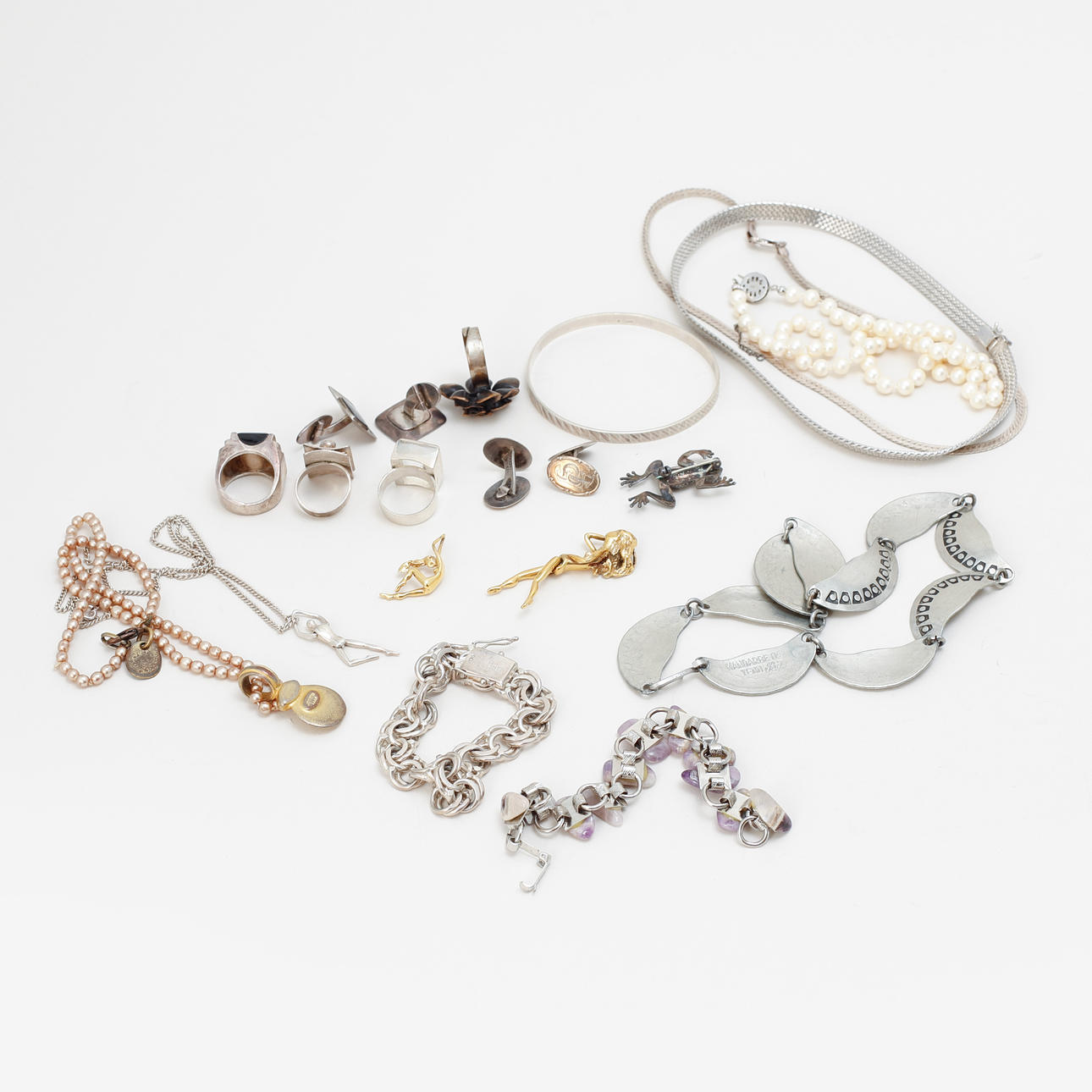 Browse 3 Charles Jourdan pendants, 4 rings, pearl necklace with silver clasp, and more.