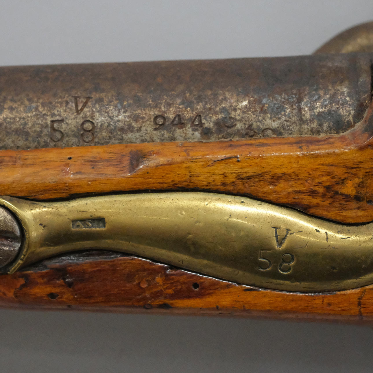 The lock plate stamped Tower as well as fitted with the Crown of Great Britain, regent initials indistinct. The barrel marked V58 and 944, and fitted with eroded stamps on the upper side. S-shaped side plate, marked V58. Back cover marked 944.
