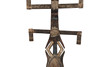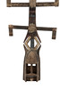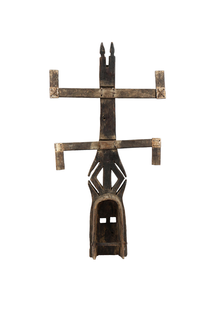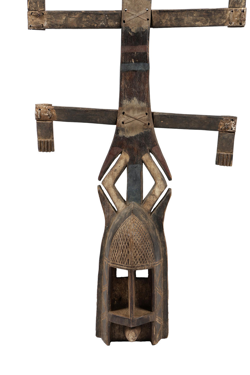 first half of the 20th century, the mask having pigmented bands above two sets of arms with a pigmented design, 102cm high