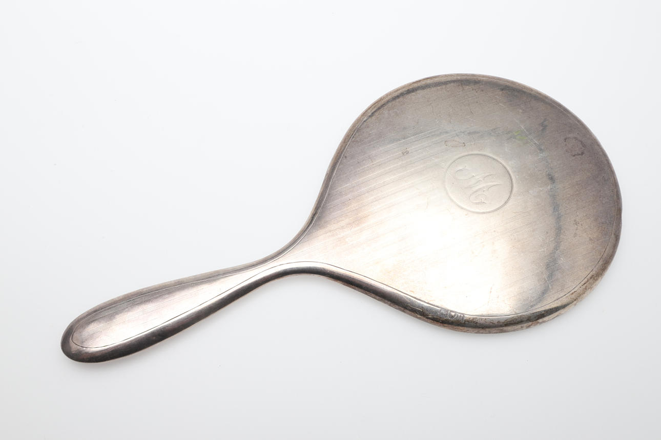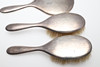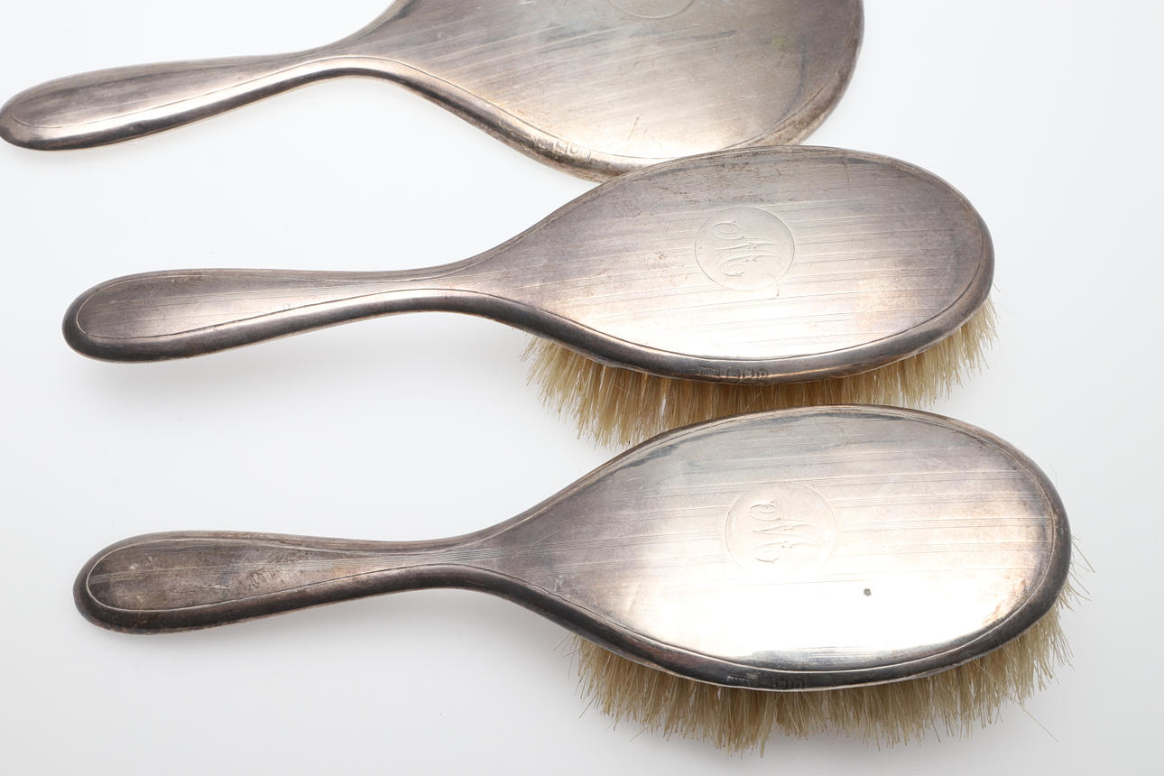 comprising of 4 brushes and a hand mirror, with engine-turned decoration and initialled "M", by Mappin & Webb, London 1915; the mirror 10.3" (27cm) long (5).