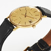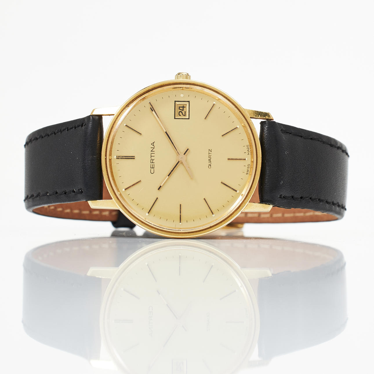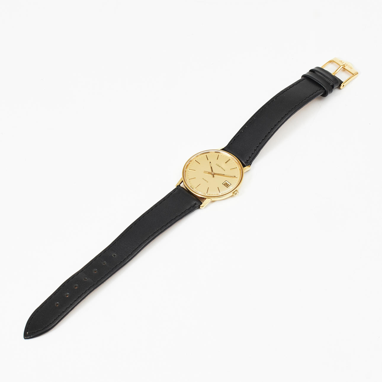 Quartz, plastic crystal, date, case no. 115.919.68, leather bracelet buckle in gold plated, diameter 33 mm, case.