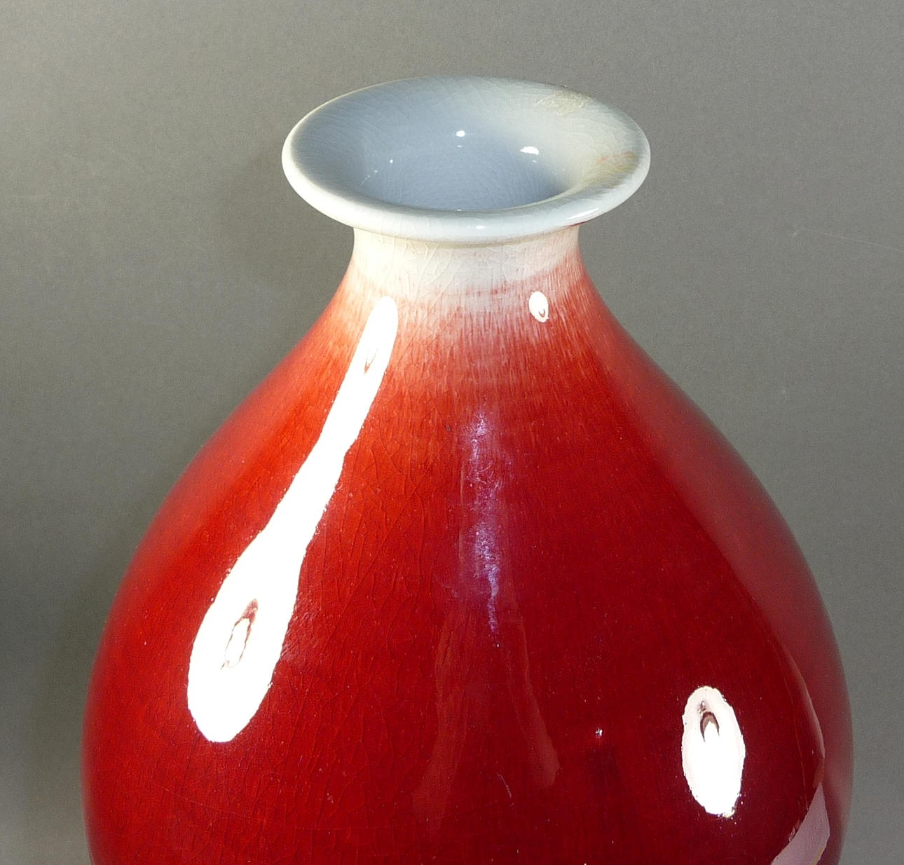 The double-bulged corpus with a short, curved rim over a round basal ring. Porcelain with dark red oxblood glaze. Underglaze blue seal mark on the bottom. H. 48.5 cm.