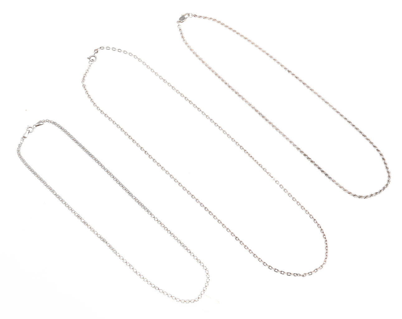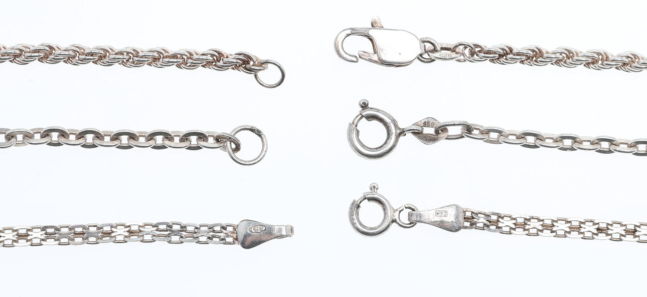 Necklace, X-link, Hallbergs Guld, length approx. 45 cm Necklace, spun link, length approx. 50 cm Necklace, anchor, length approx. 59 cm Total weight approx. 29 grams.