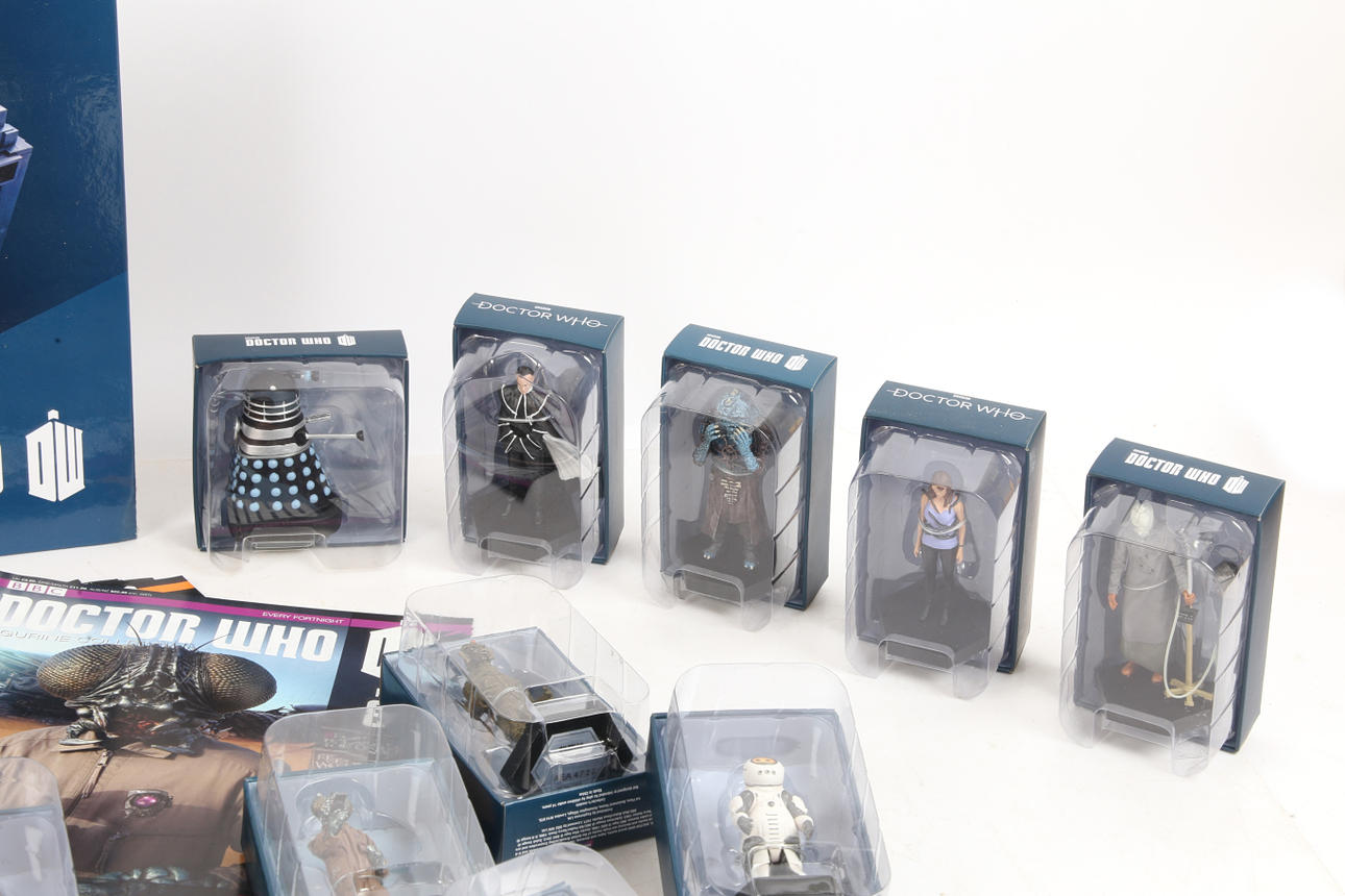 To include Tritovore (81), Vervoid (82), Black Dalek (99), Ice Queen Iraxxa (114), Silurian (69), Monoid (84), Emojibot (119), The First Doctor (120), The Valeyard (150), Patient (116), The Ancient One (130), Whisperman (78), Kerblam Man (153), Carrionite (90) and Lin/ Dalek (165), often with their relevant magazine in an official binder. (15).