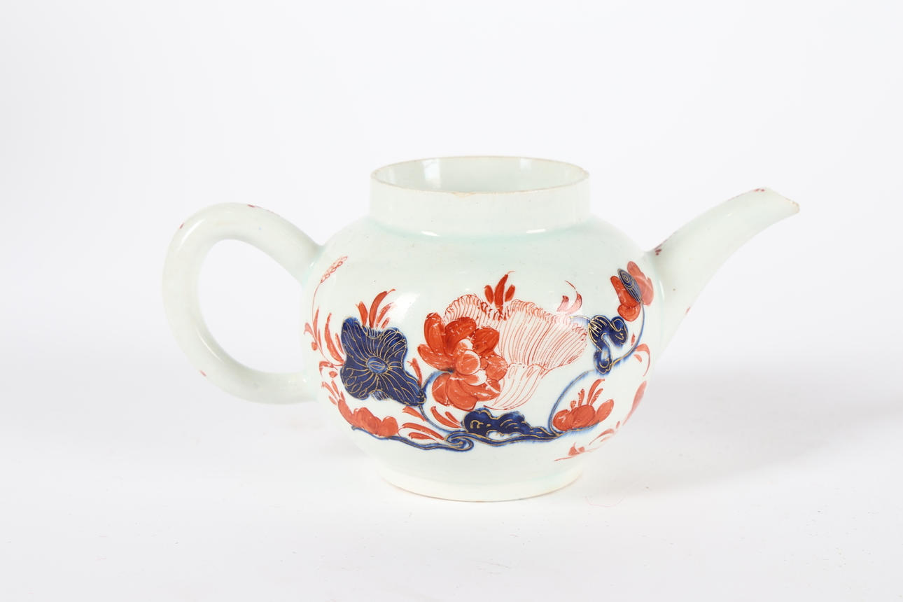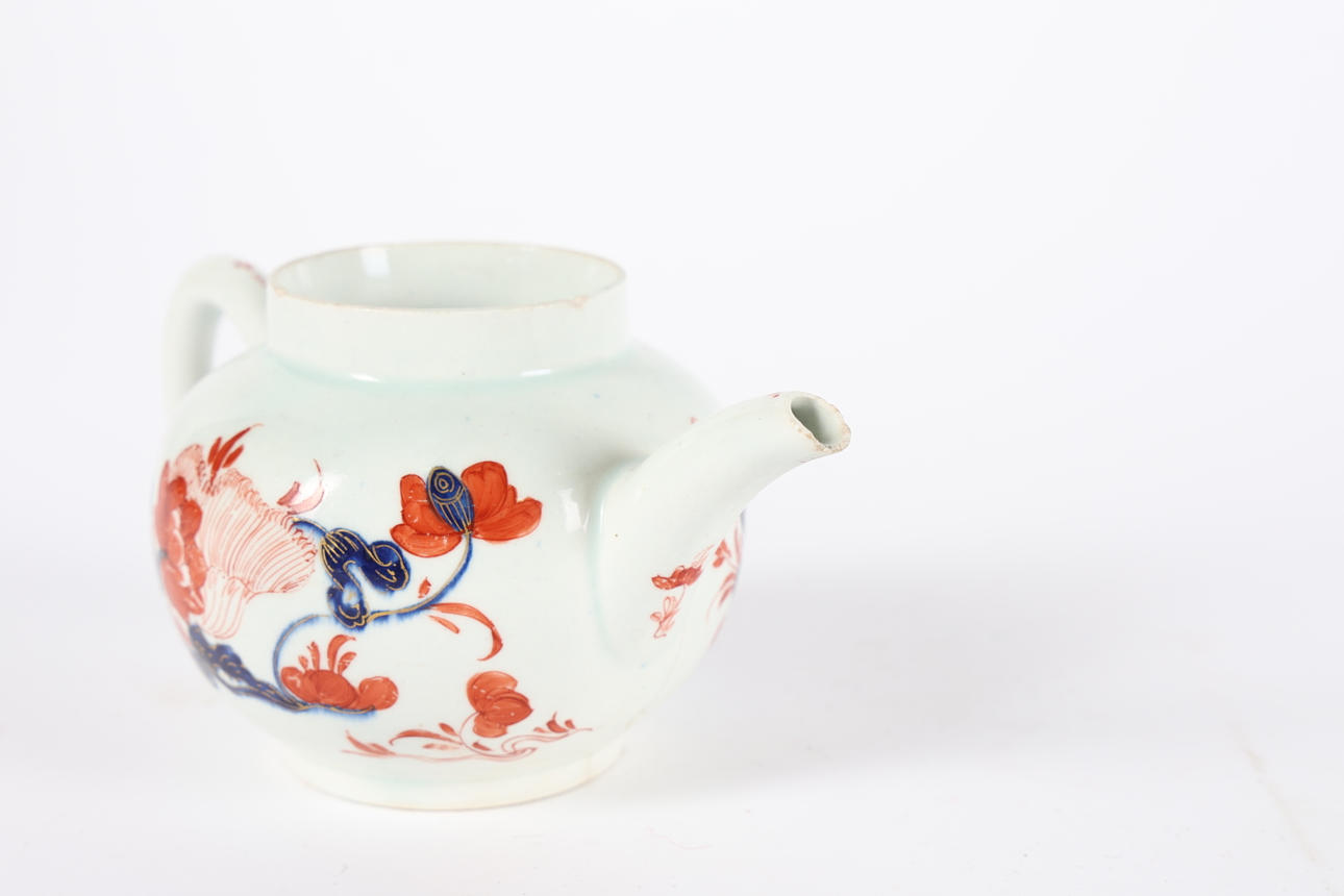 Lid missing, chips to the rim and spout, cracked to the body and base.