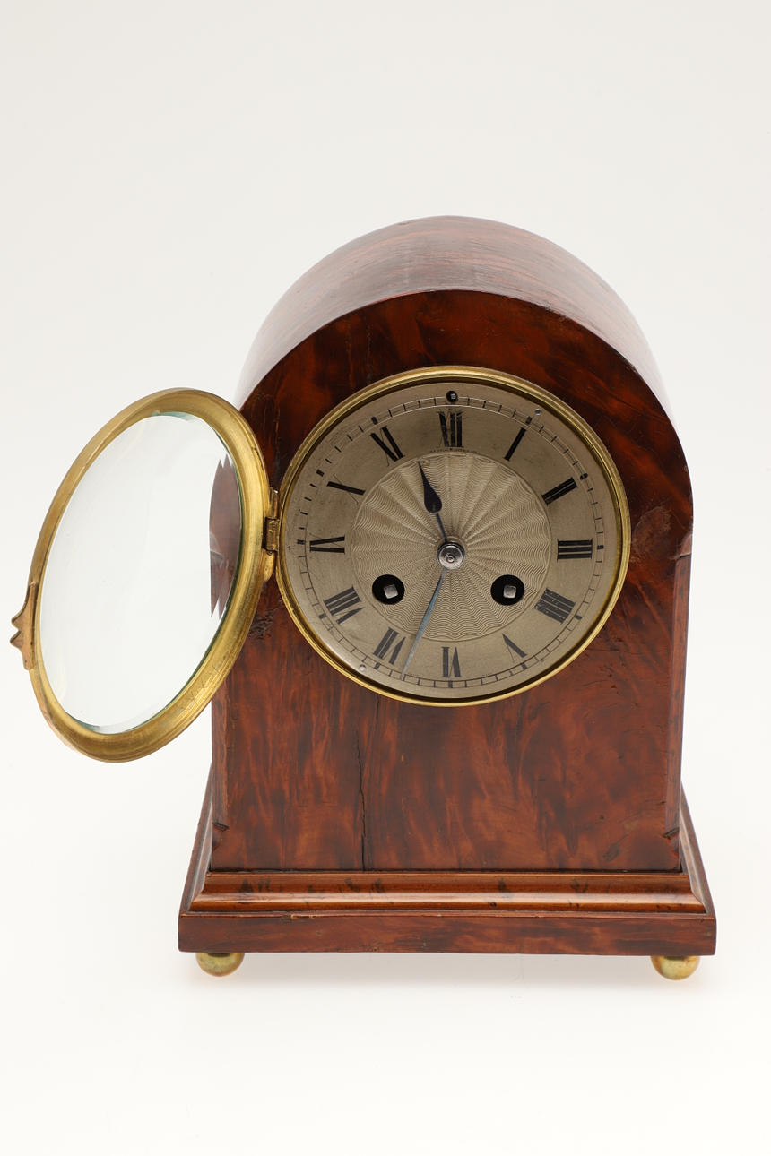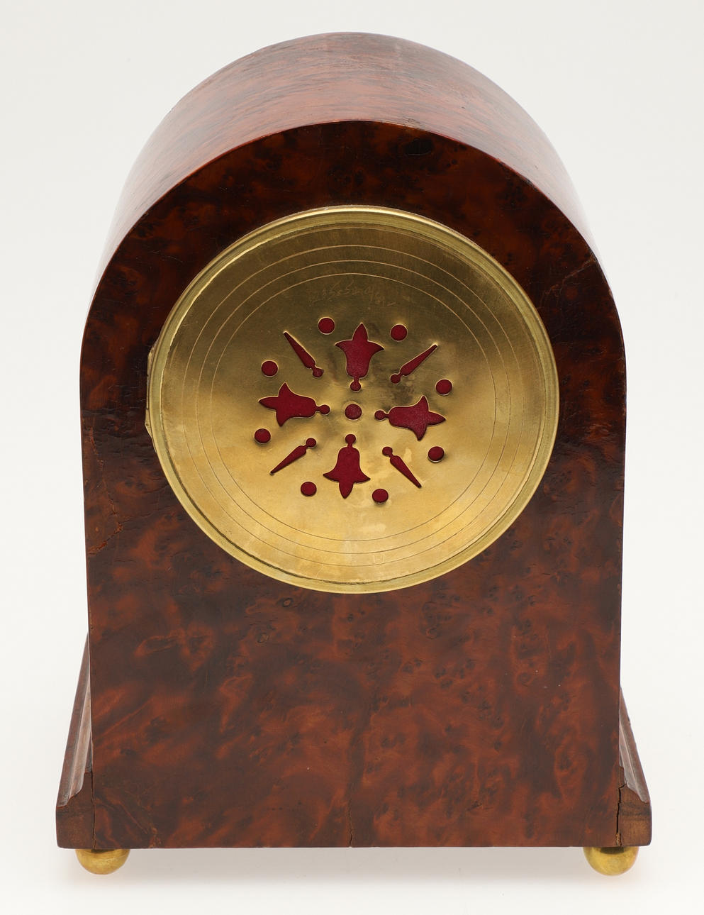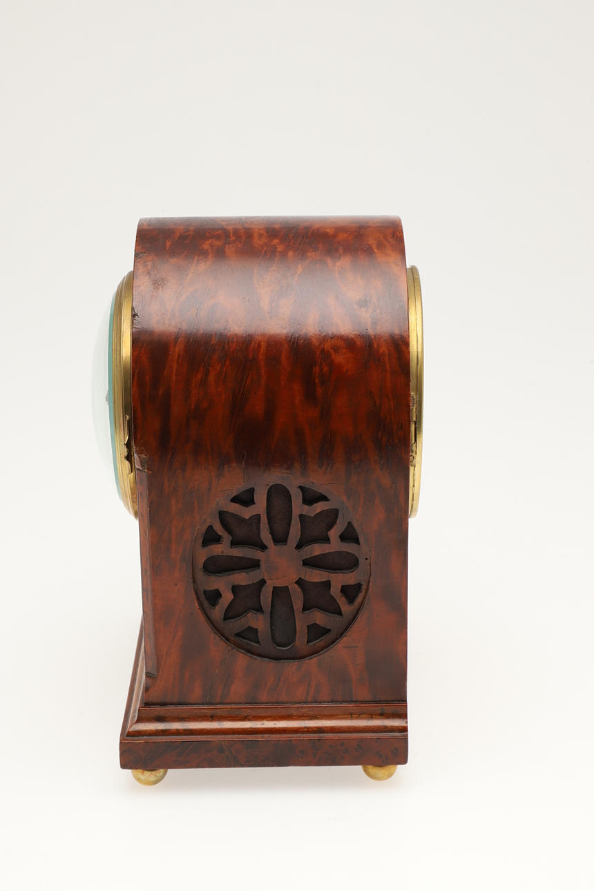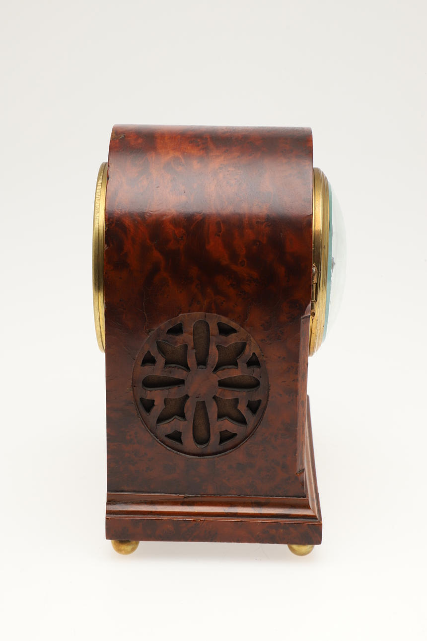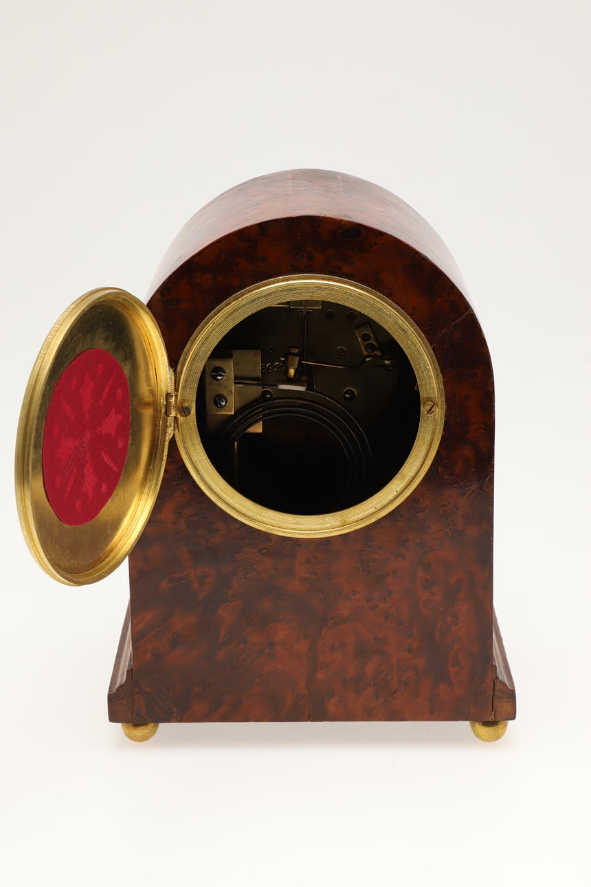 3710458. A BURR WOOD DOME TOPPED MANTEL CLOCK.