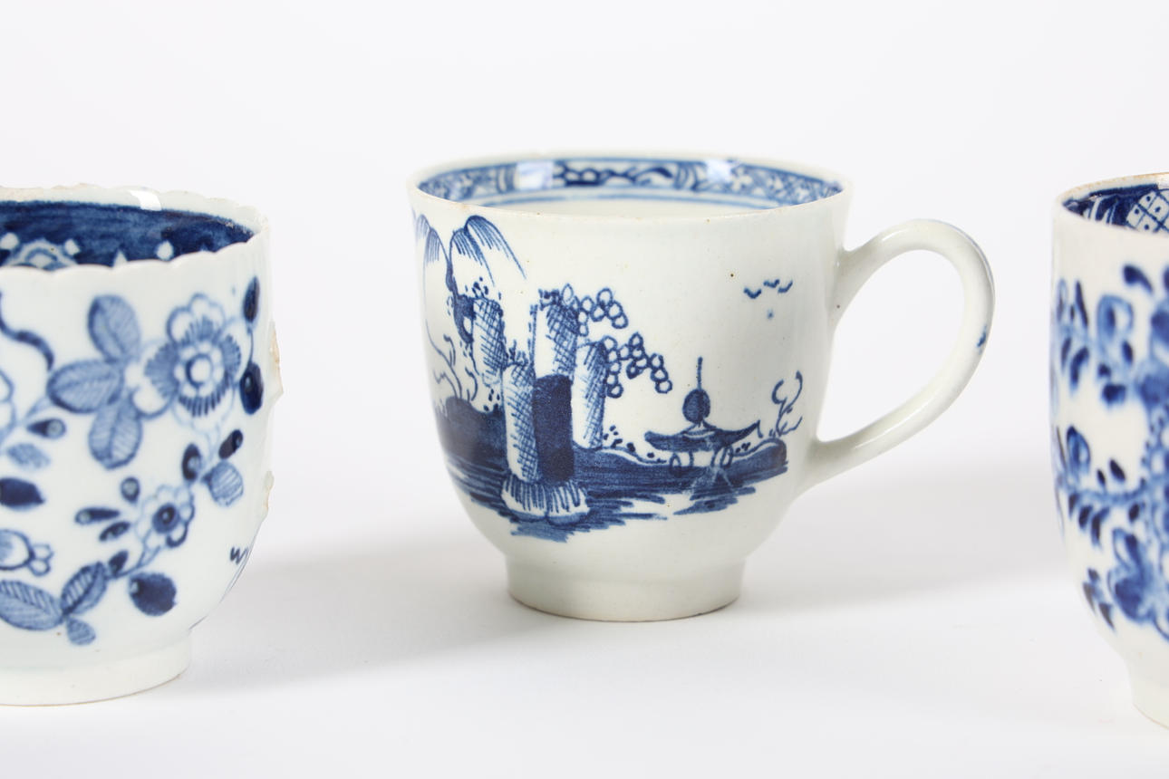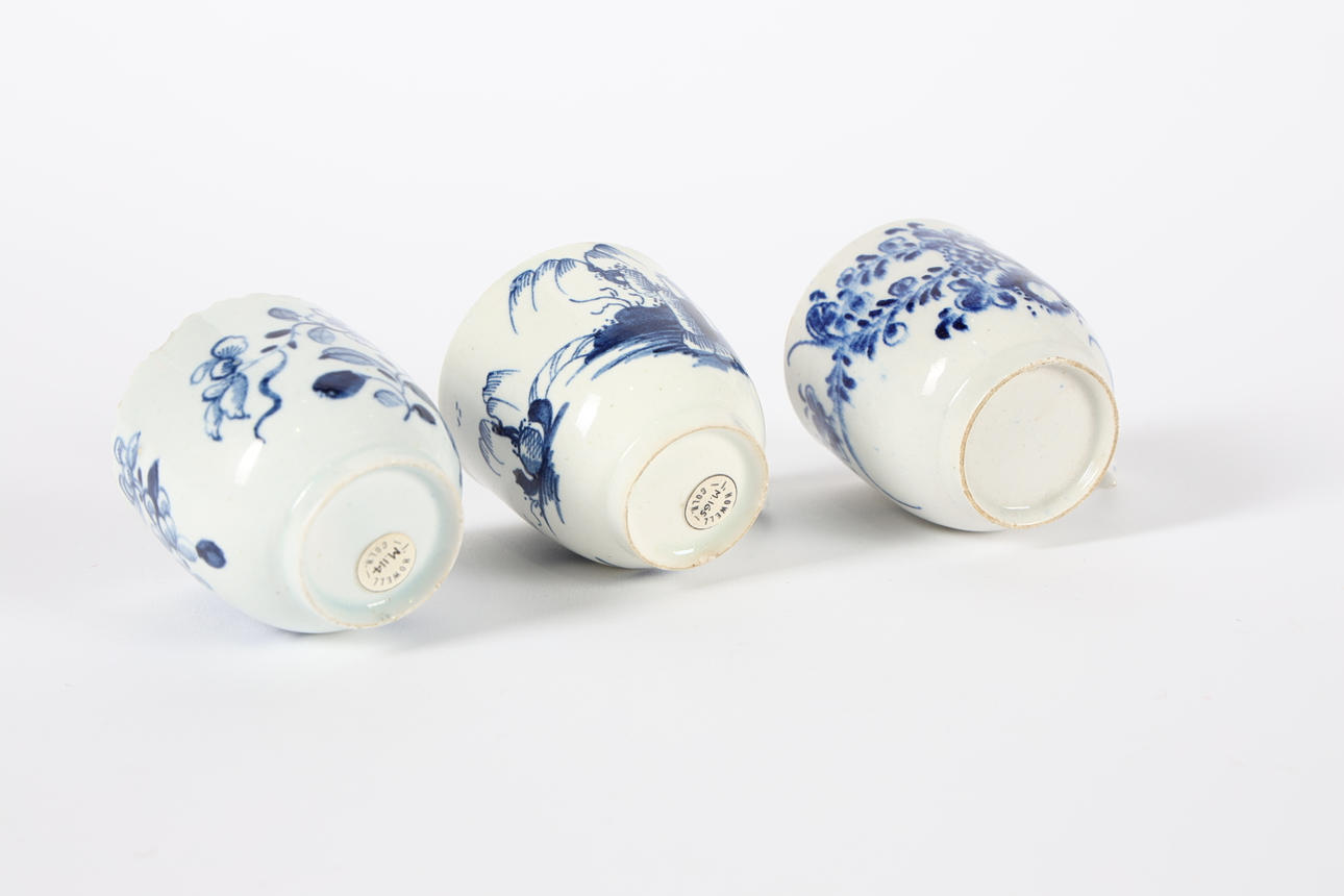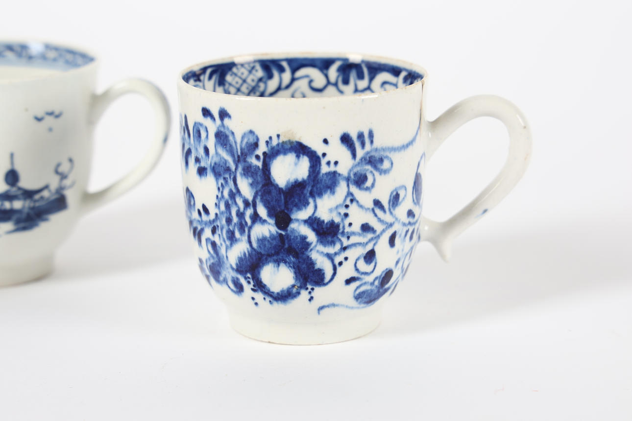 3710959. THREE 18TH CENTURY BLUE AND WHITE COFFEE CUPS.