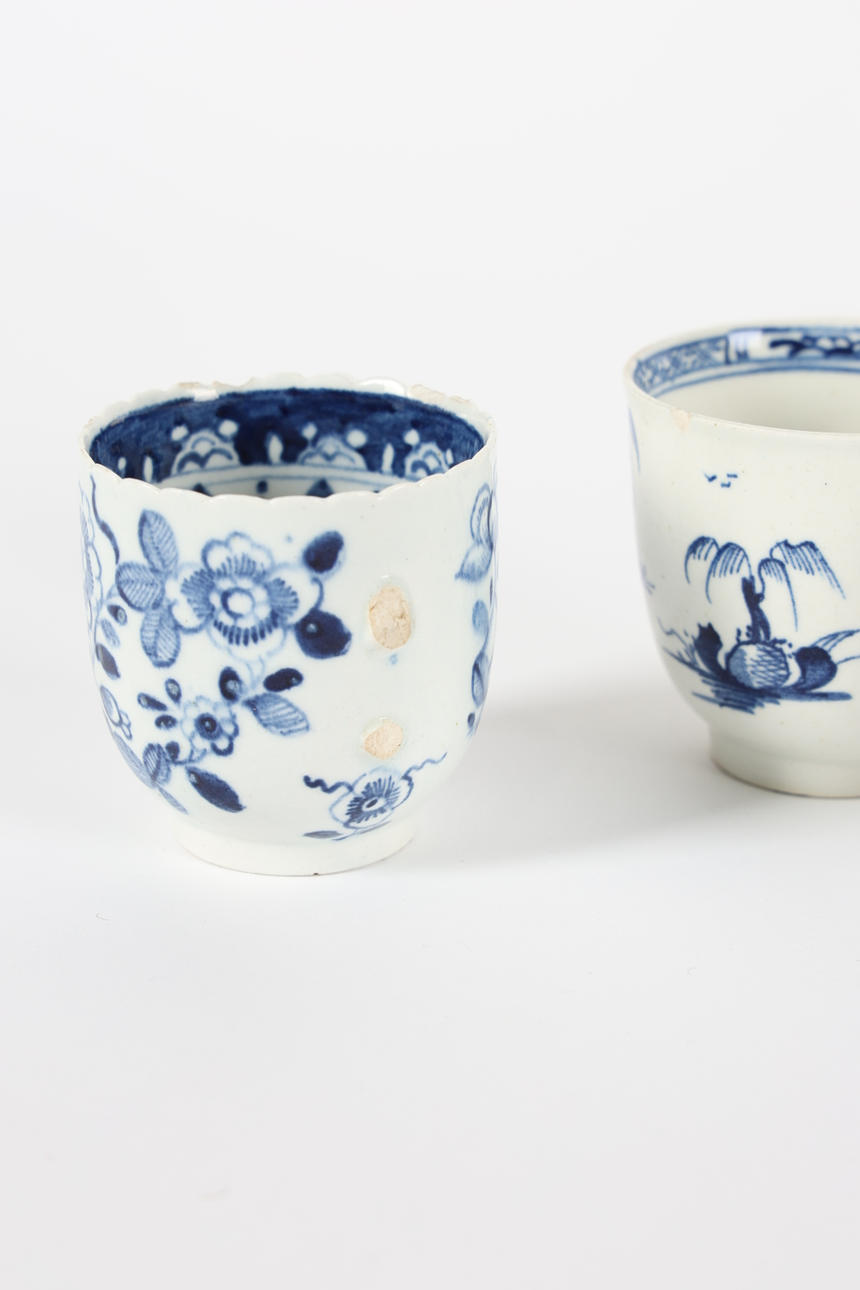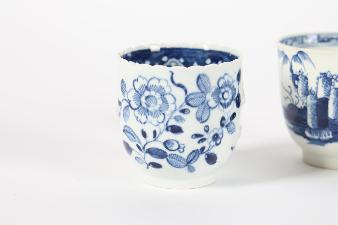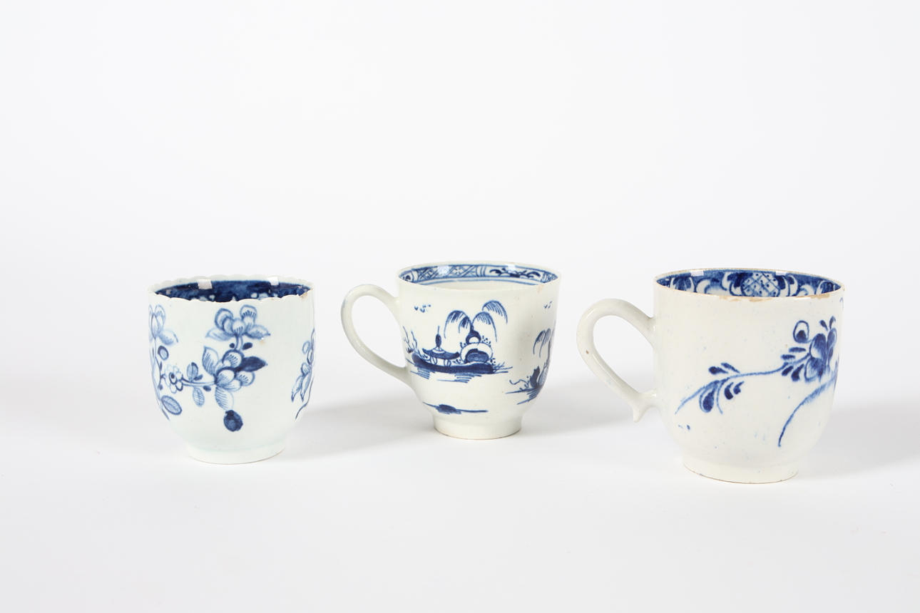 3710959. THREE 18TH CENTURY BLUE AND WHITE COFFEE CUPS.