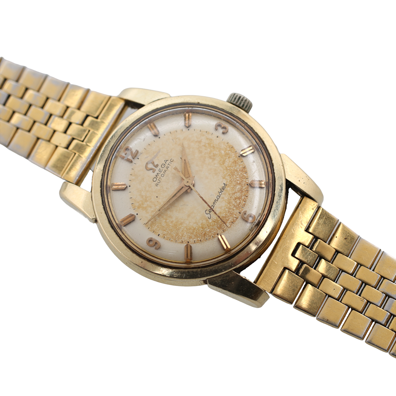 Crown replaced, dial with dirt in the middle, wear & scratches, chips in glass, not working.