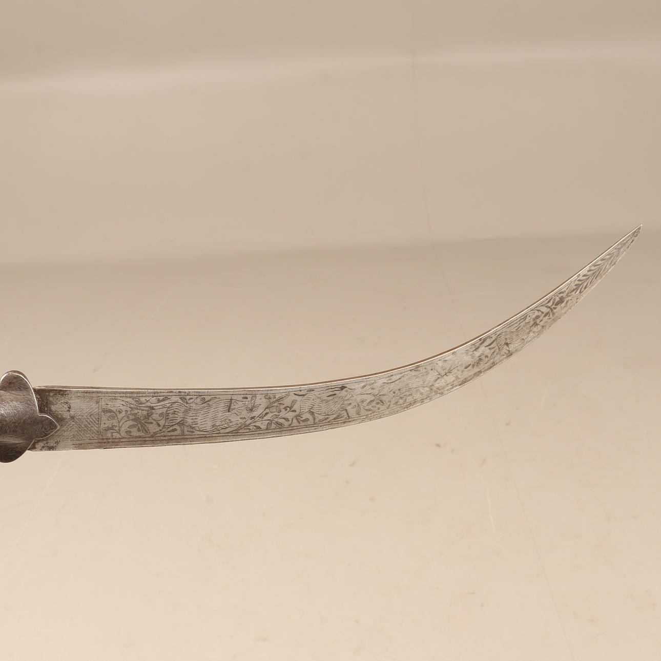 Short saber with iron attachment with stylized bird head, blade with inserts and etched decoration. Length 62 cm. Indo-Persian.