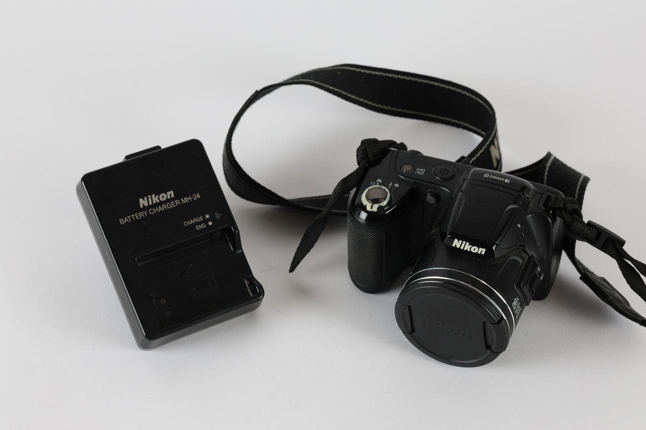 The Nikon 16.1 Megapixel camera with a Nikkor 26X Wide Optical Zoom ED VR 4.0-104mm 1:3.1-5.9 lens and a Nikon Battery Charger MH-24. (2).