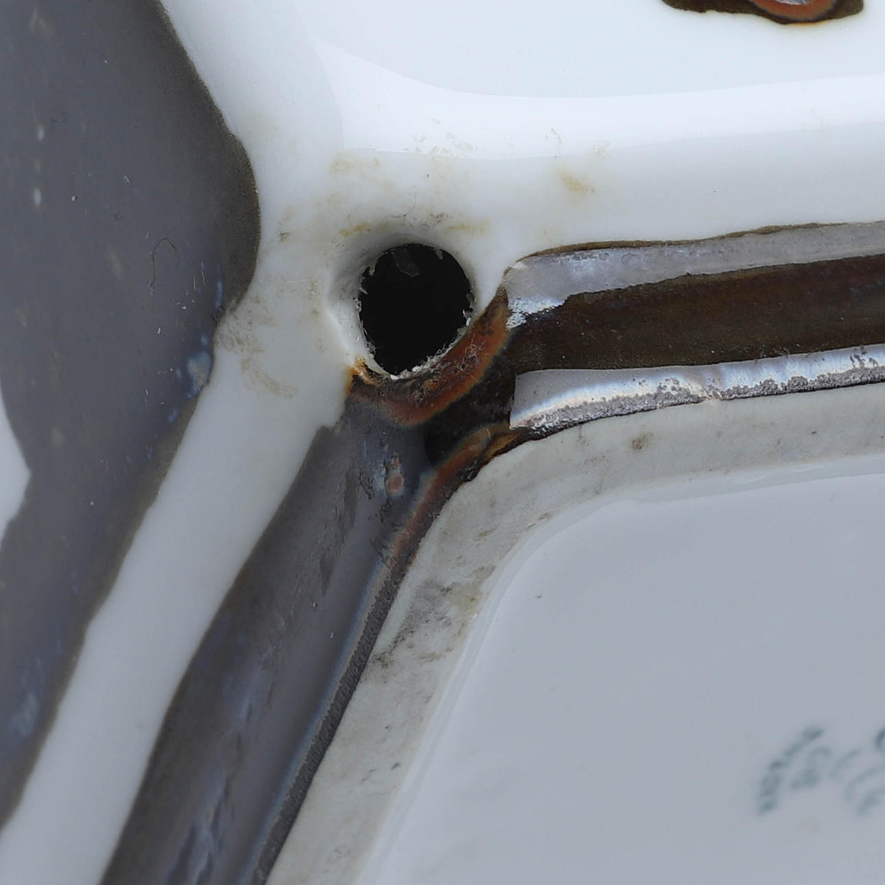 Normal wear and tear. Drilled for lamp and cord.