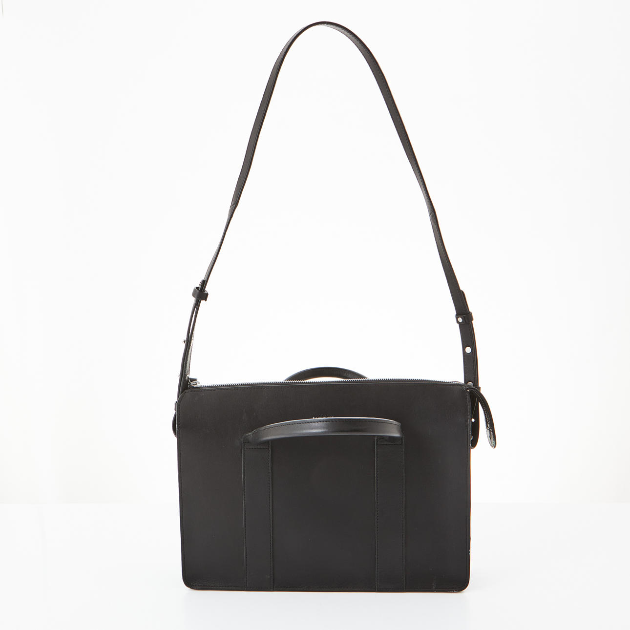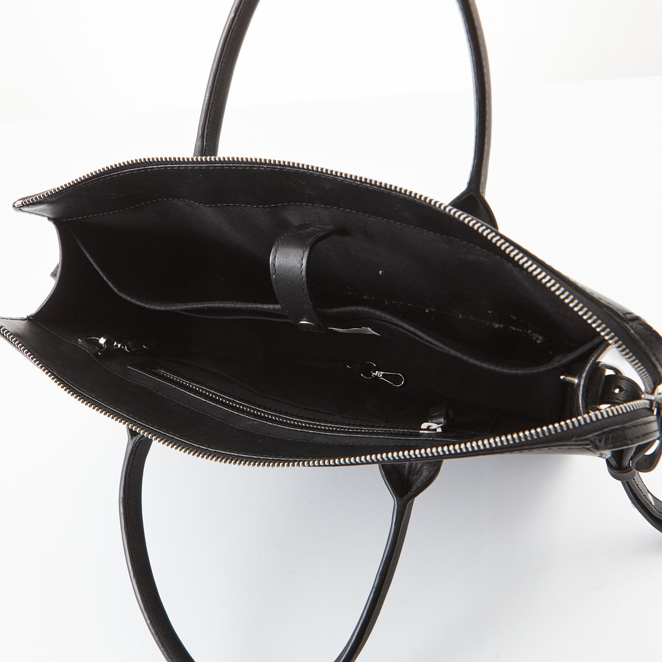 In black leather, top handle model with detachable and adjustable shoulder strap, zipper and details in matte white metal, lined in black canvas, inside with removable lanyard, laptop compartment and five smaller compartments, one with zipper, marked “Sandqvist”, dimensions approx. 36x26x8cm.