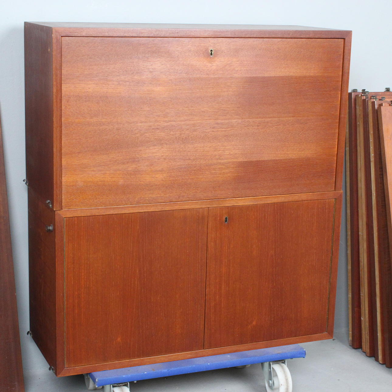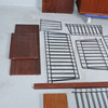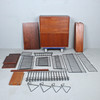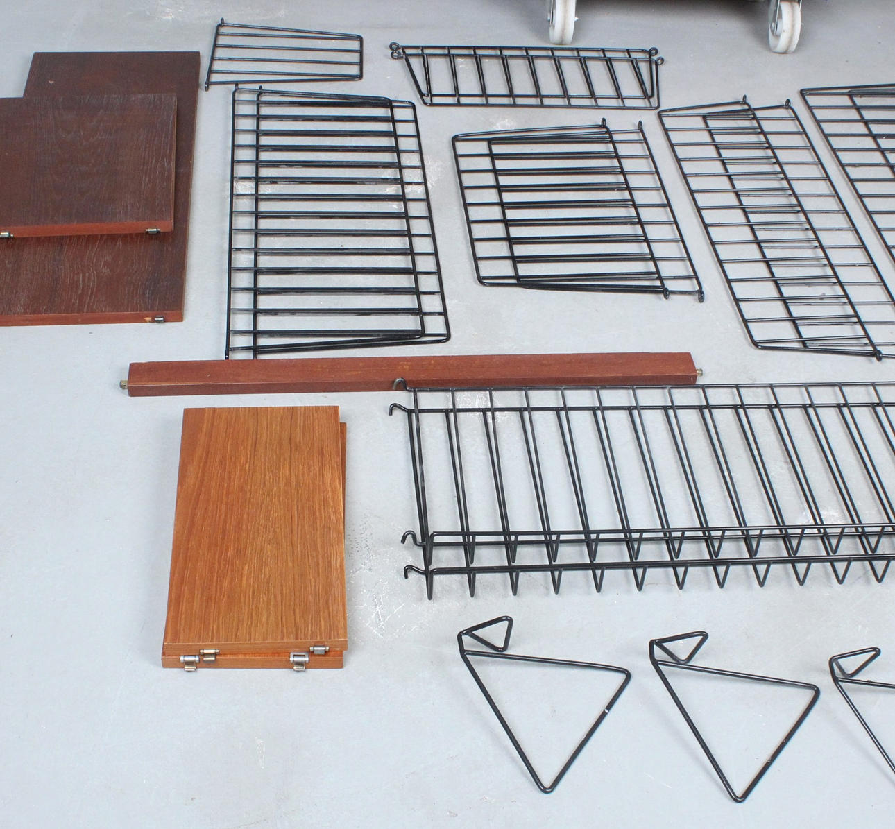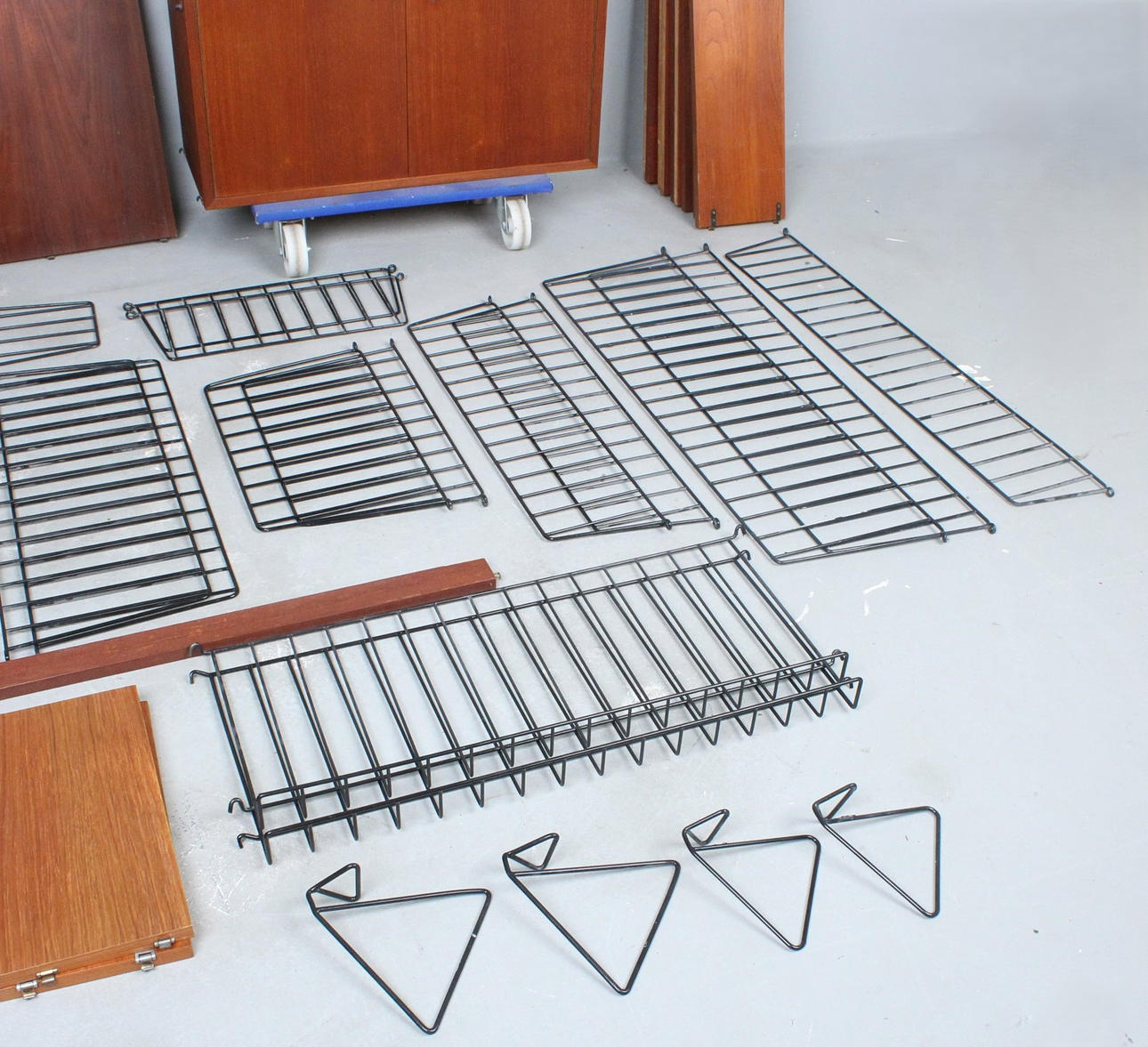 Shelving system consisting of two cabinets, 14 shelves, 12 ladders, 2 newspaper shelves, 4 bookends and various holders and screws.
