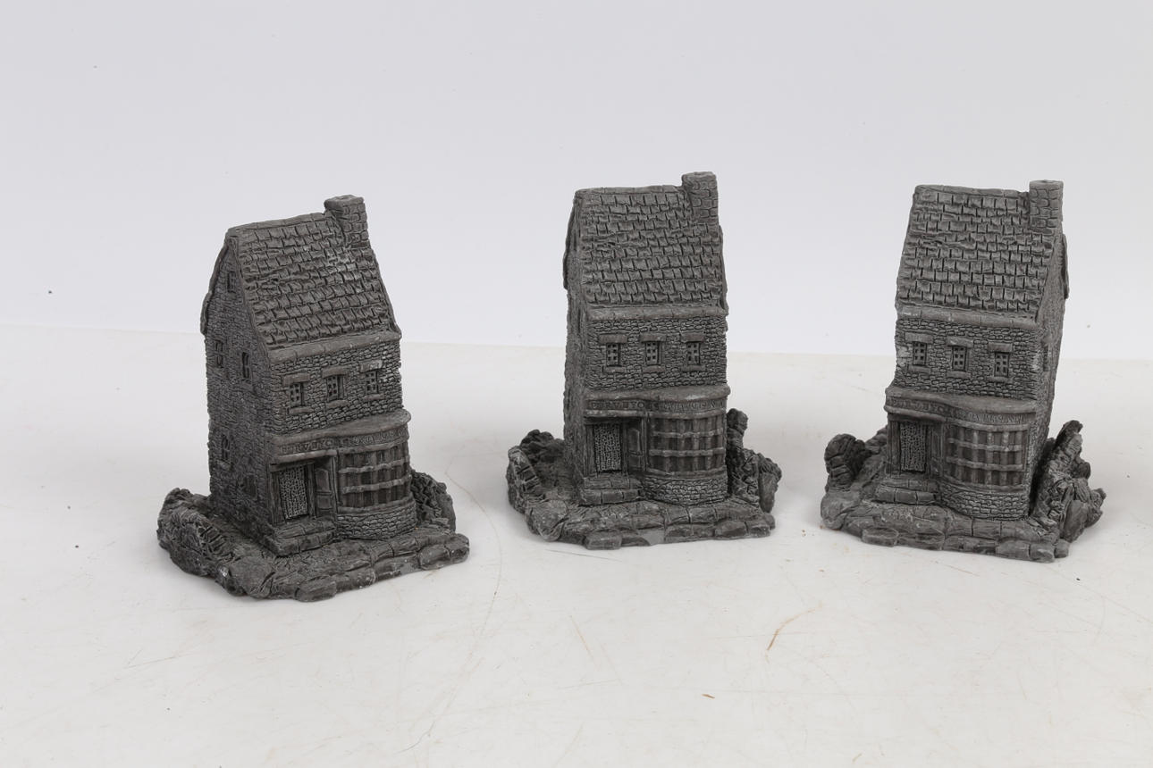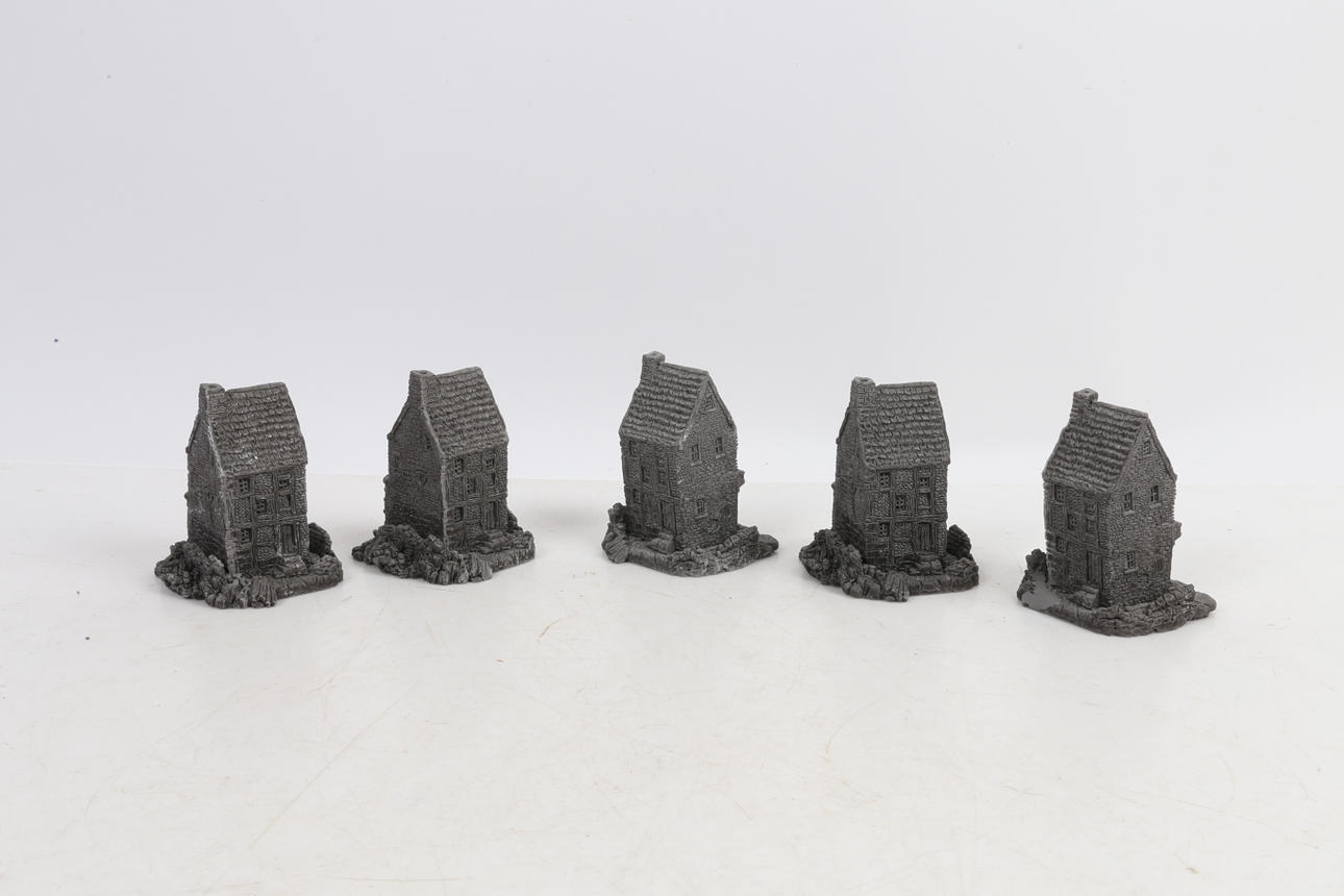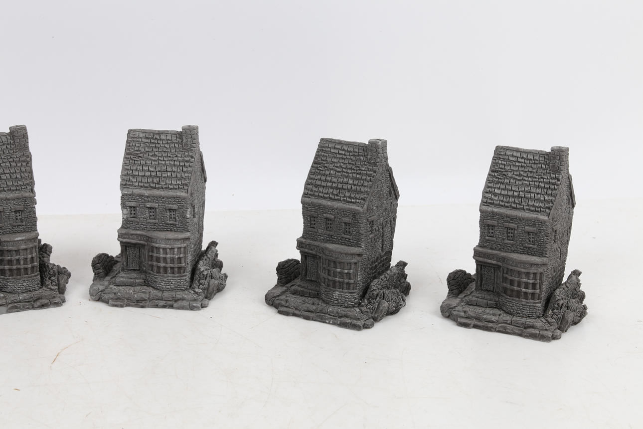 Five unfinished Clarecraft shops modelled as 'The Wandering Shop' from Terry Pratchett's Discworld, each measuring 8.5cm height, 7cm width, 7cm depth. (5)