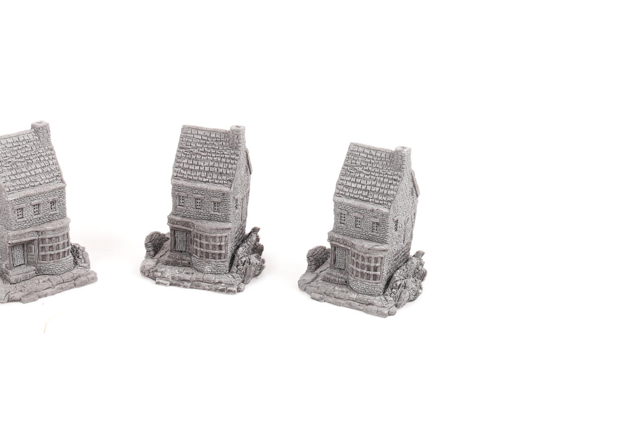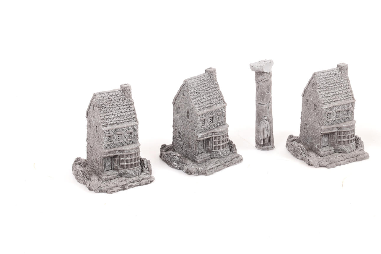 Five unfinished Clarecraft shops modelled as 'The Wandering Shop' from Terry Pratchett's Discworld, each measuring 8.5cm height, 7cm width, 7cm depth, together with an unfinished pillar measuring 9.5cm length. (6)
