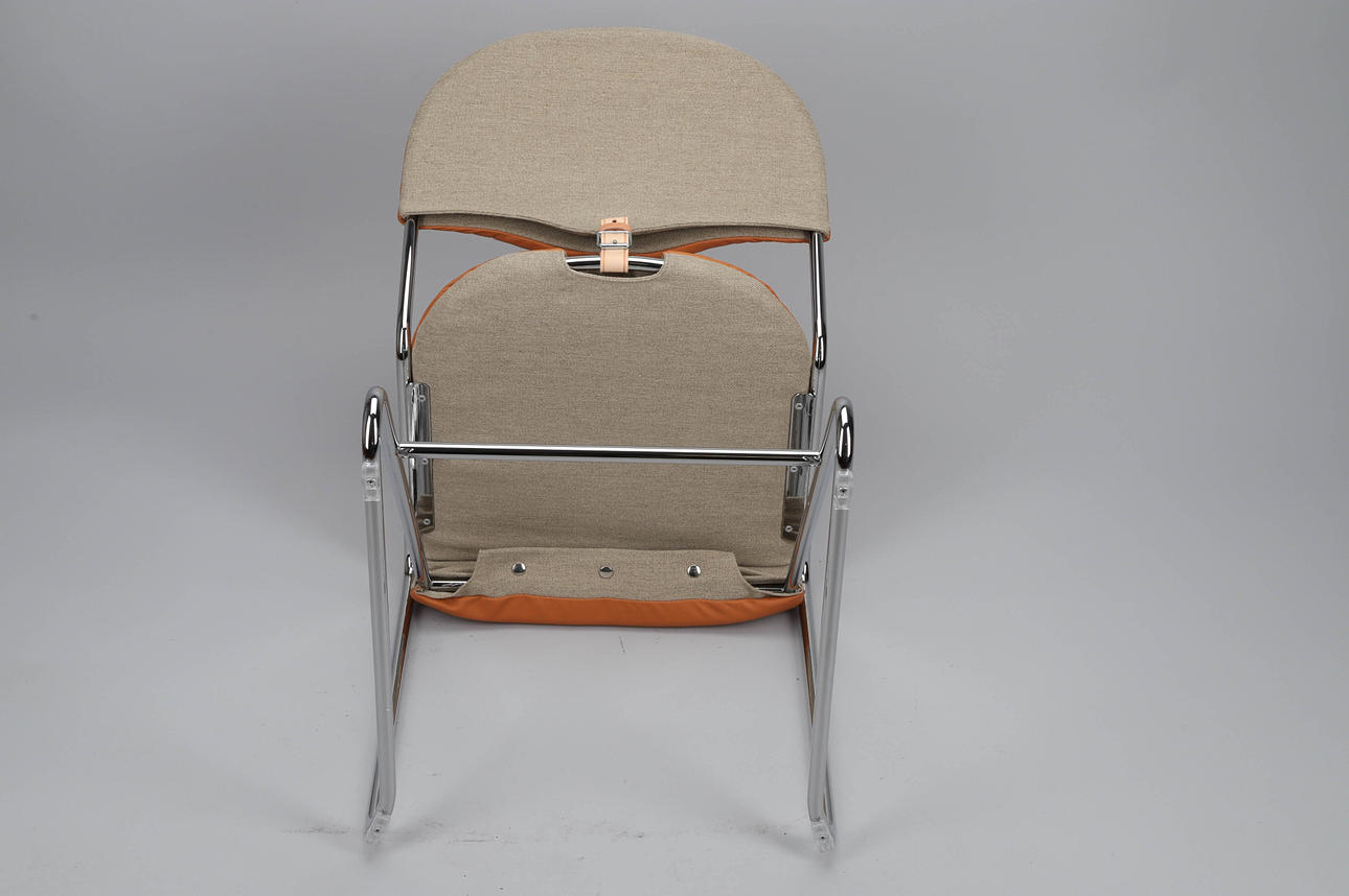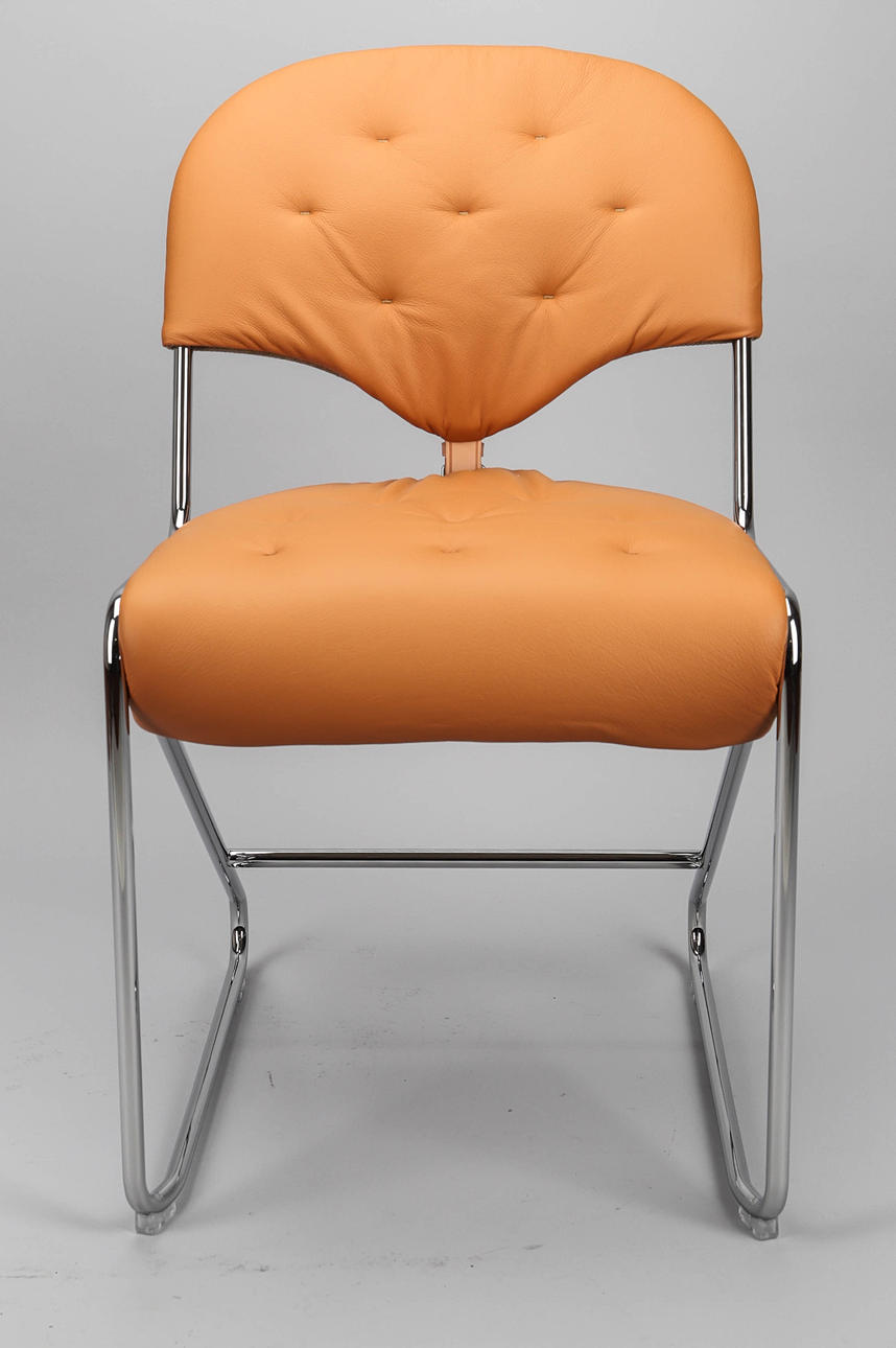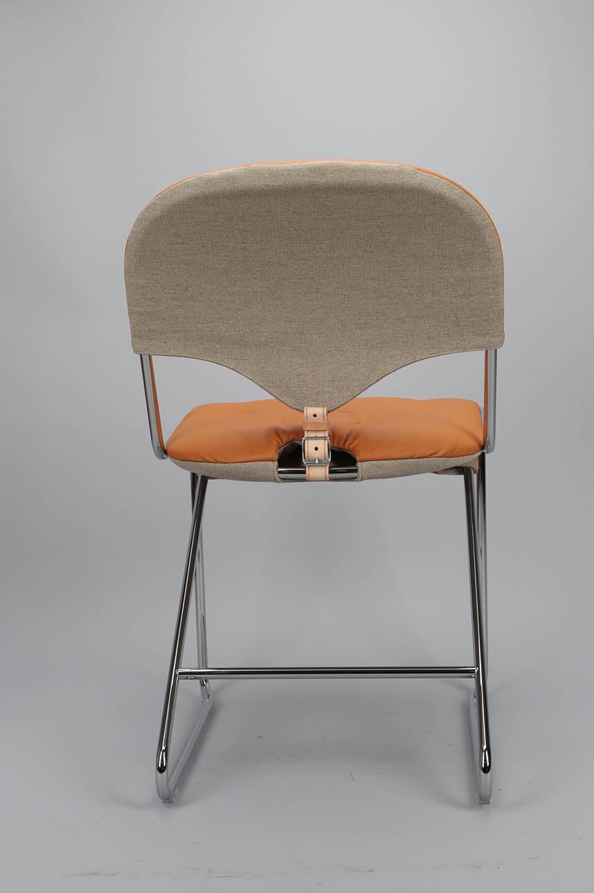 Chromed metal frame, seat and back in brown leather Elmo soft. Back height 82 cm, seat height 45cm.