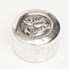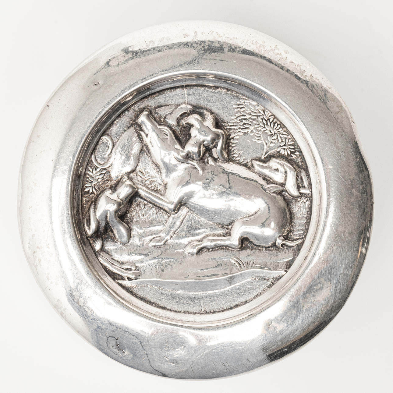 Lid with hunting dog. Diameter 4, height 2.5 cm. Weight about 27.8 grams.