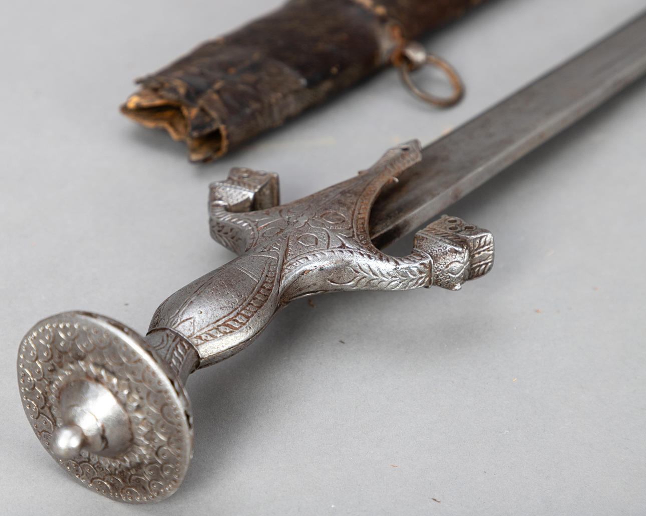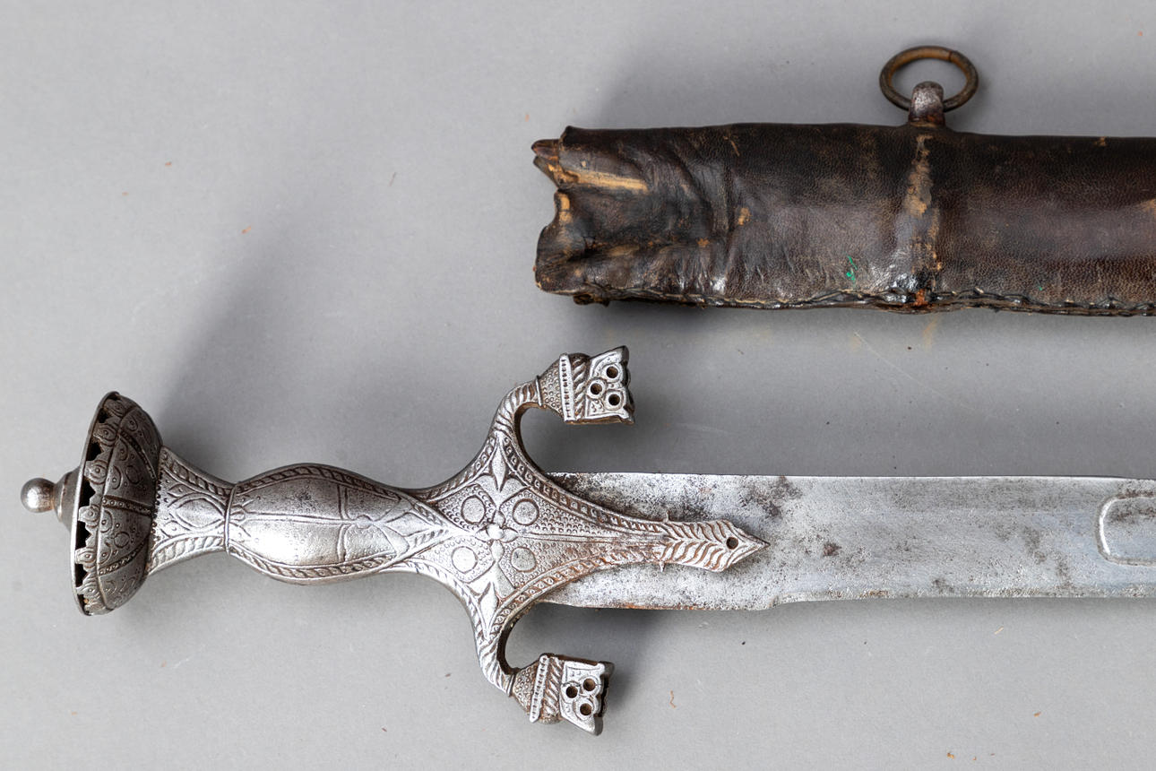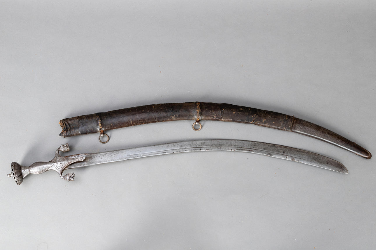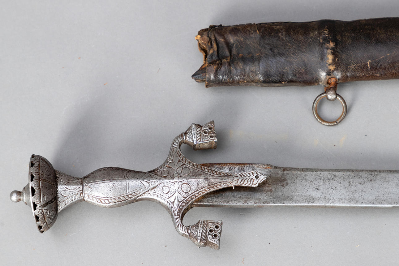 Pulwar, Afghanistan, 19th century, curved, single-edged blade with hollow cuts of varying degrees, typically decoratively decorated handle with characteristic, bent guard pointing to the location and a disc-shaped knob at the end, matching metal sheath and leather covering.