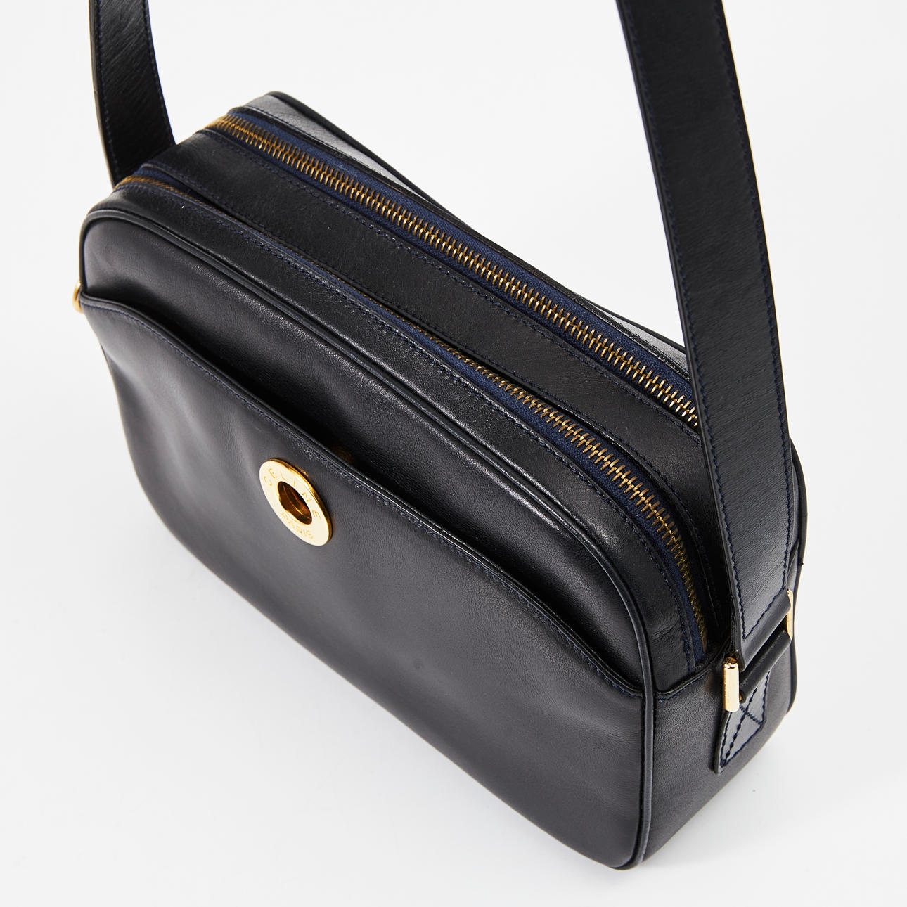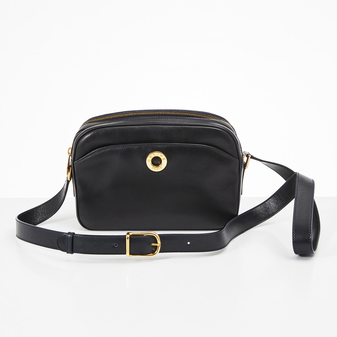 3740307. CELINE, shoulder bag in plain leather, circular push button at the front labeled CELINE PARIS.