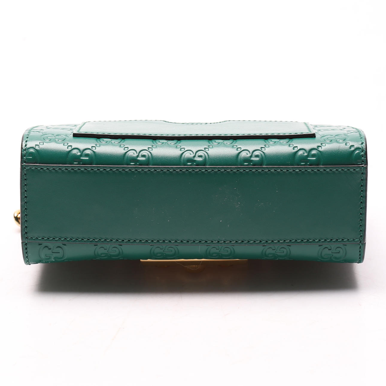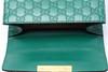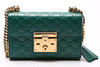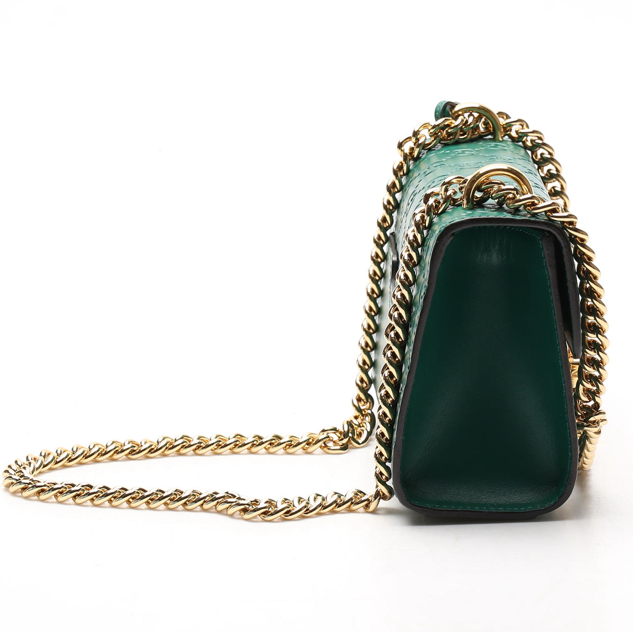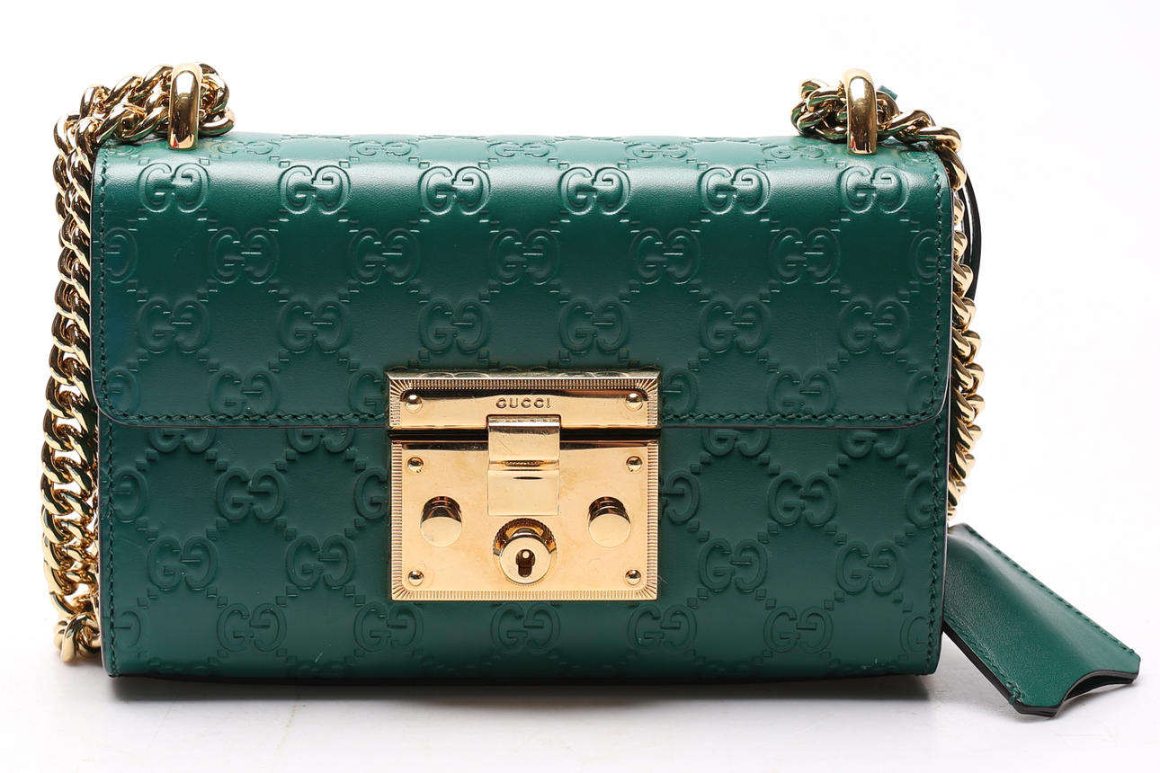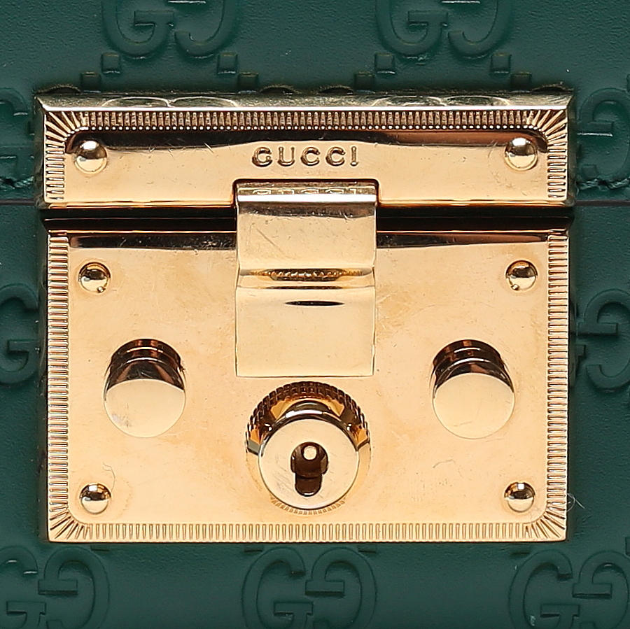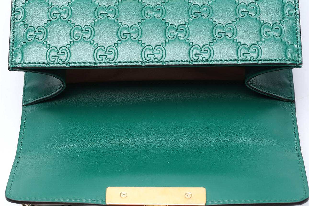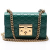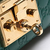 Guccissima monogram patterned green leather with details and chain in plated metal. With lock and two included keys. Shoulder strap in chain model.