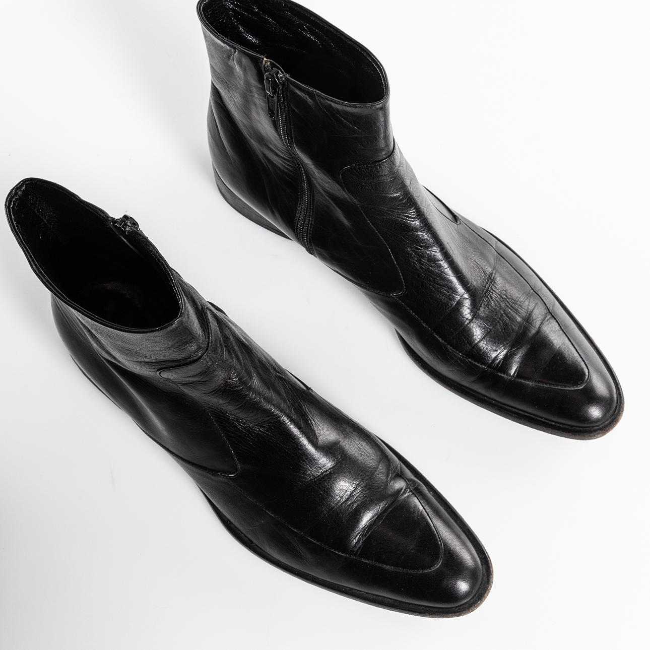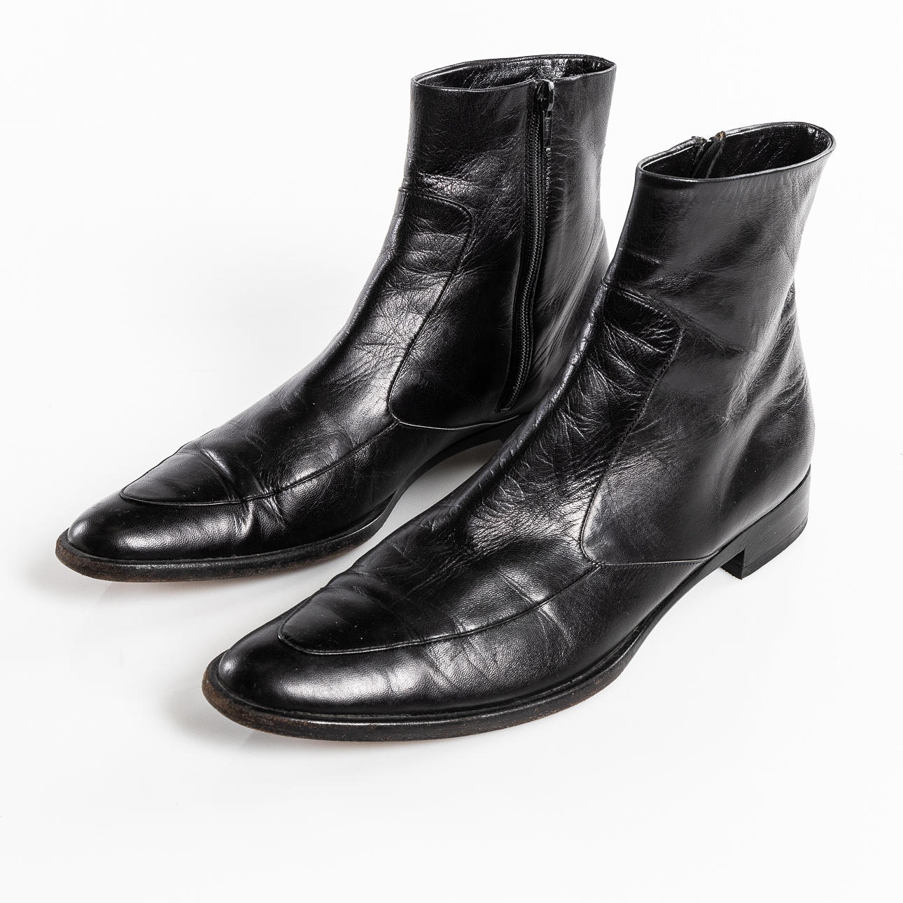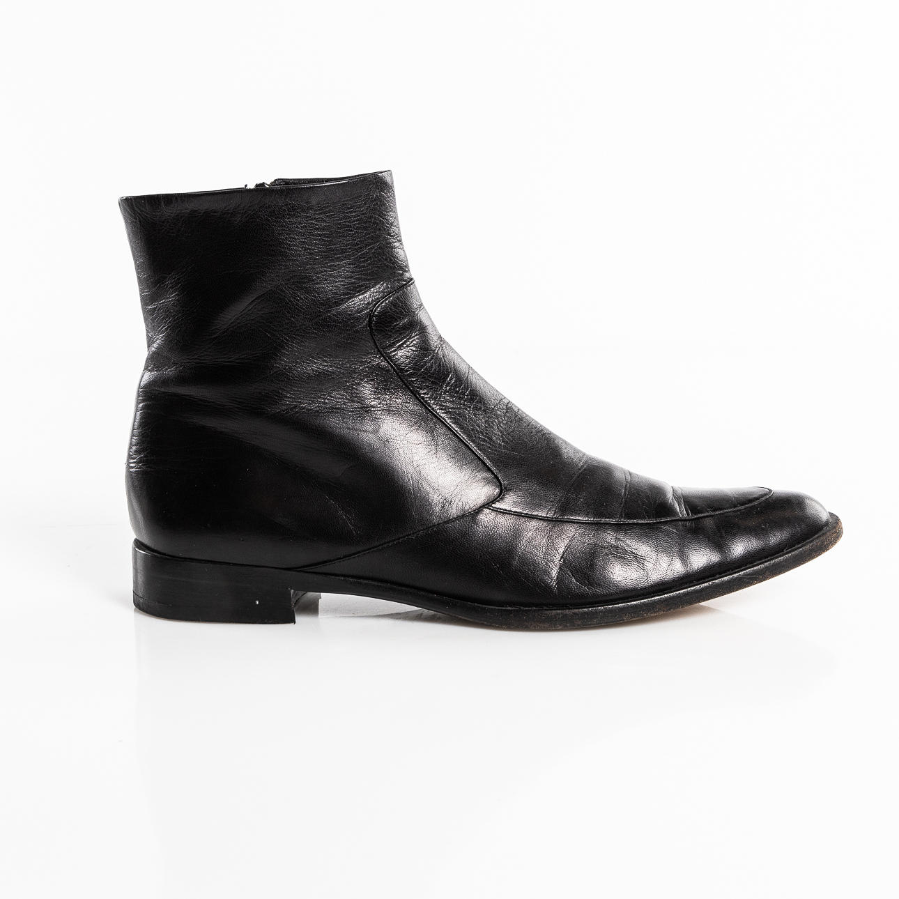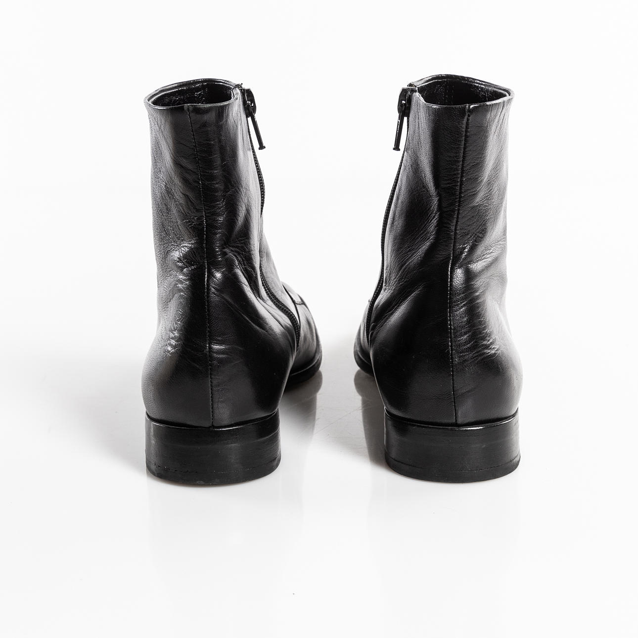in black leather with zipper on the inside. Low heel, approx. 3 cm, inner dimension approx. 26,7 cm.