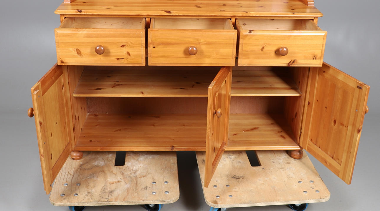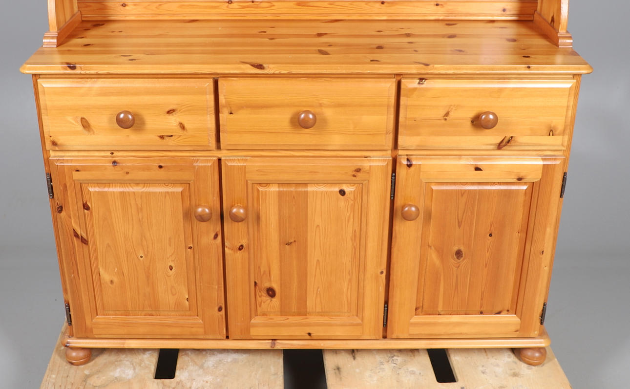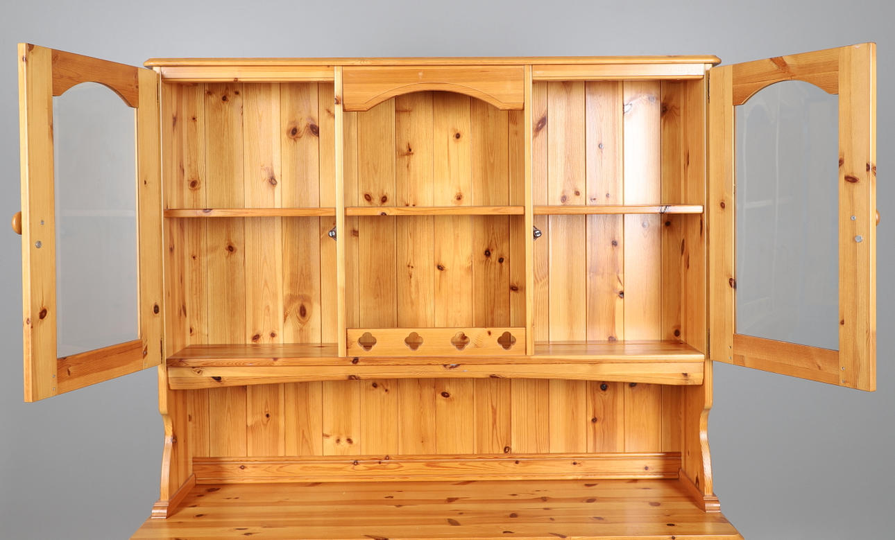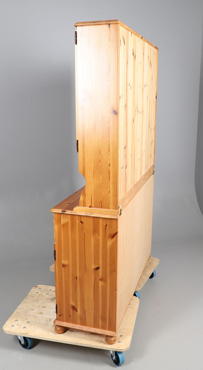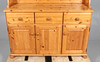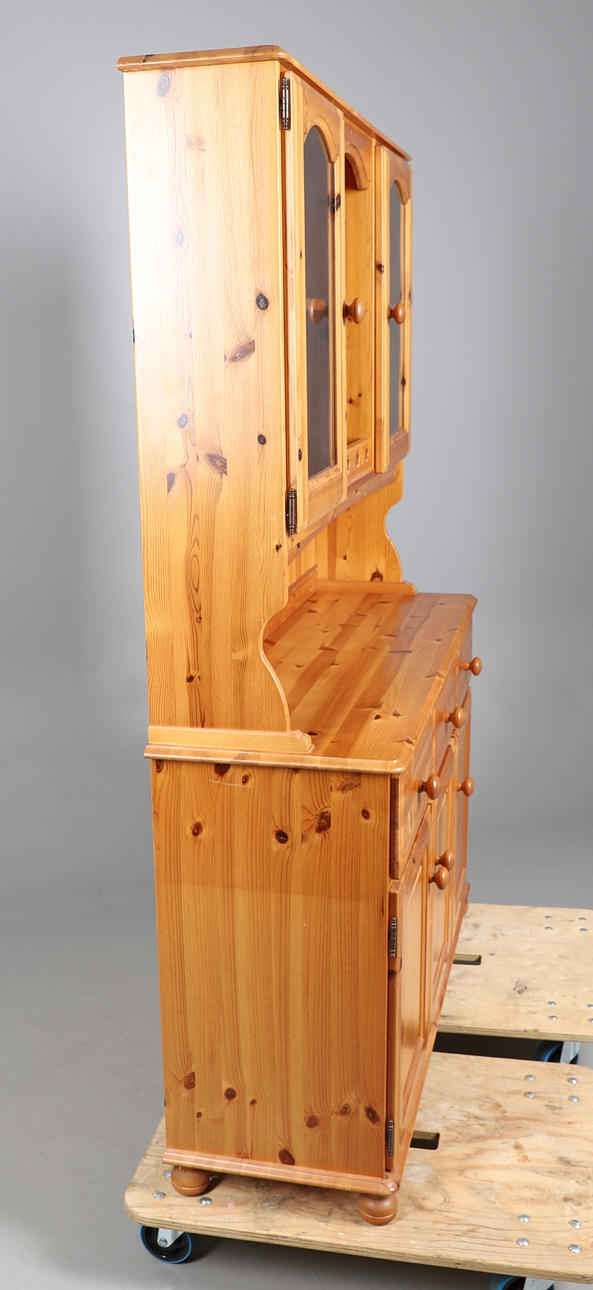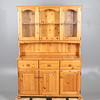 Late 20th century, the upper section with two glazed cupboards flanking shelves, the base fitted an arrangement of drawers and cupboards.