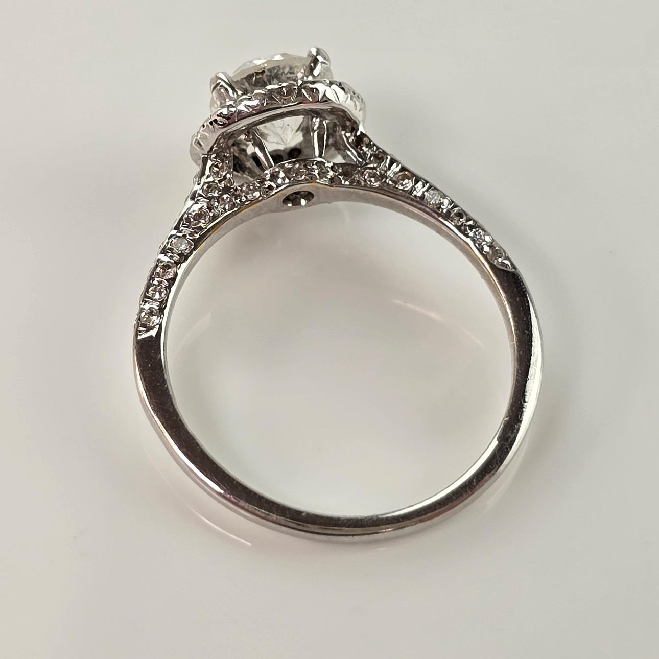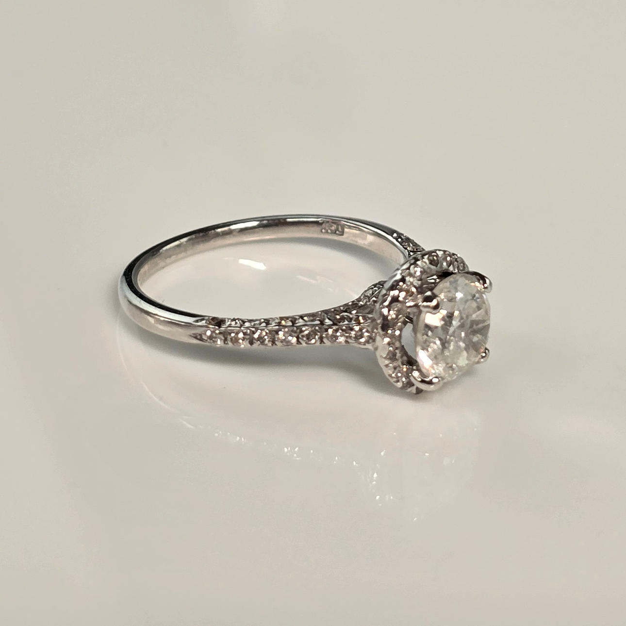 Diamond ring - white gold 750/000 (18K), stamped, set with 1 faceted brilliant-cut diamond of ca. 0.90 ct. (color G-H/ clarity PI2), surrounded by 18 small cut diamonds, shoulders set with other small diamonds, weight approx. 2.59 g, ring size approx. 51/52.