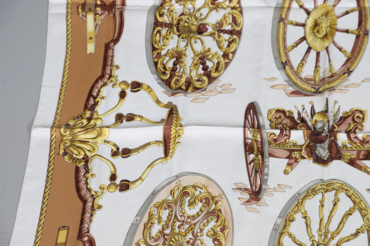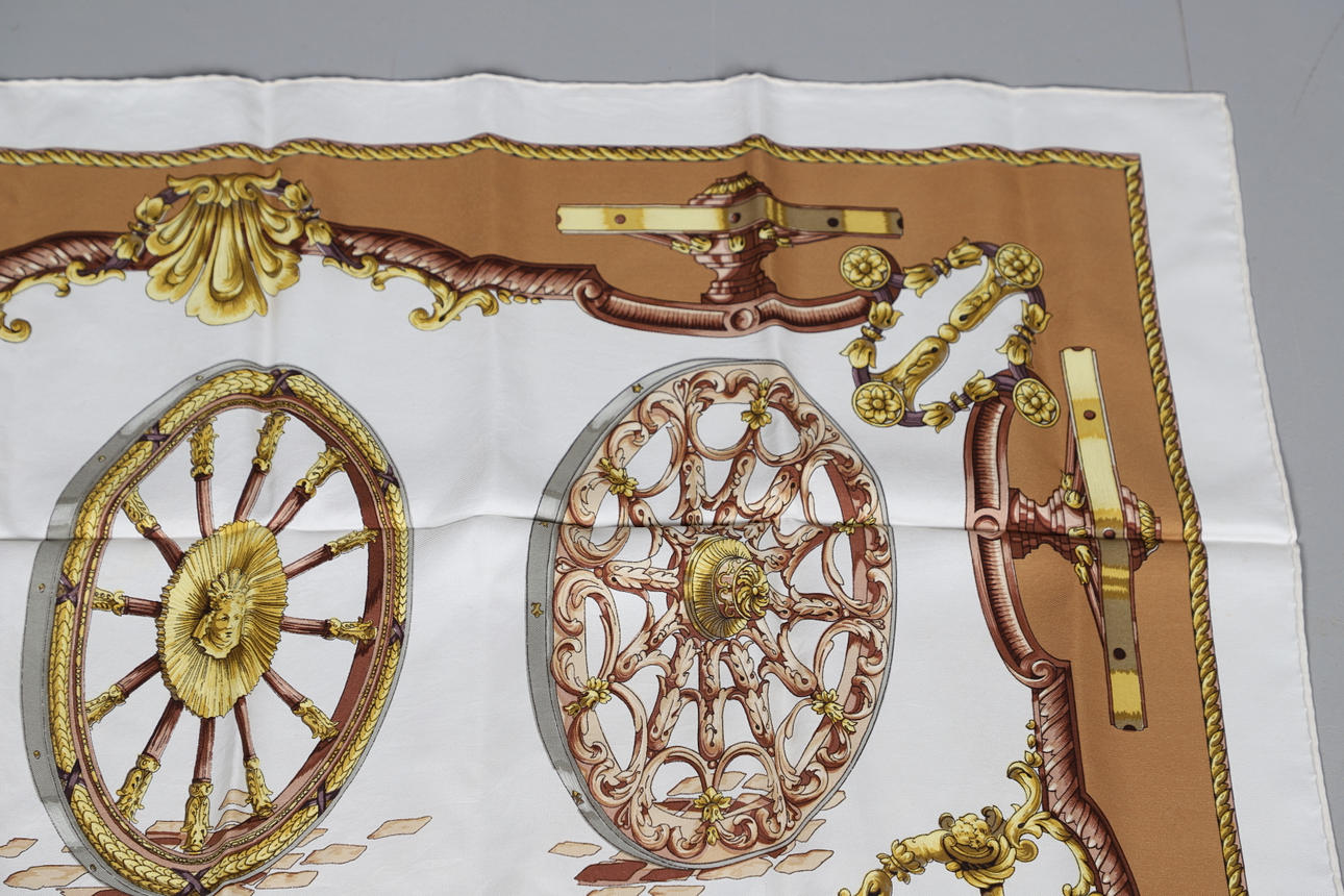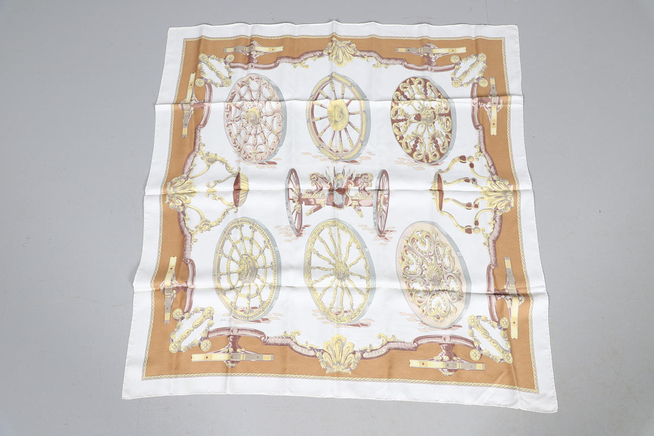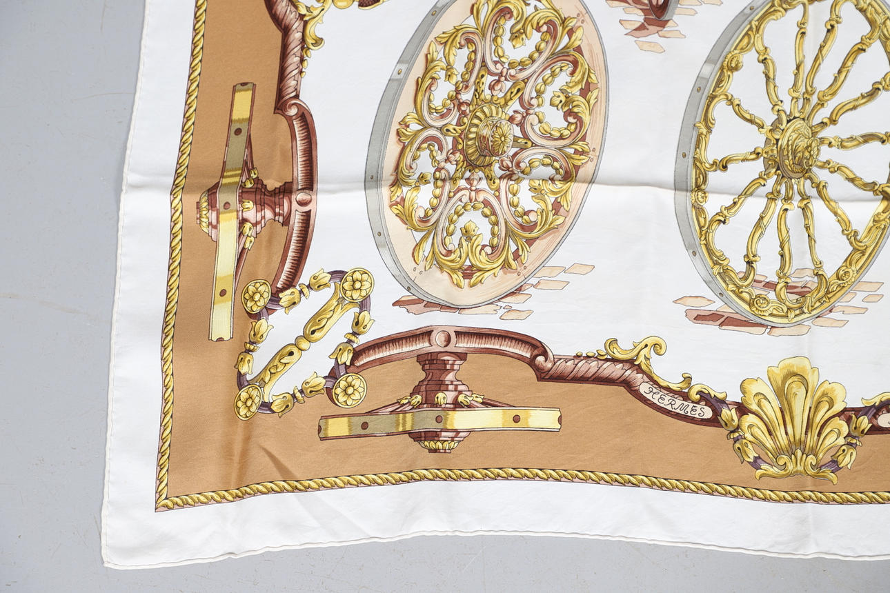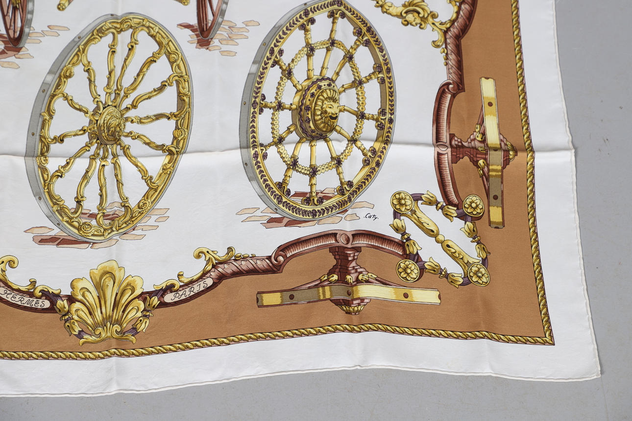 A Hermes silk scarf 'Roues de Canon', designed by Caty Latham. 89cms by 87cms.