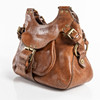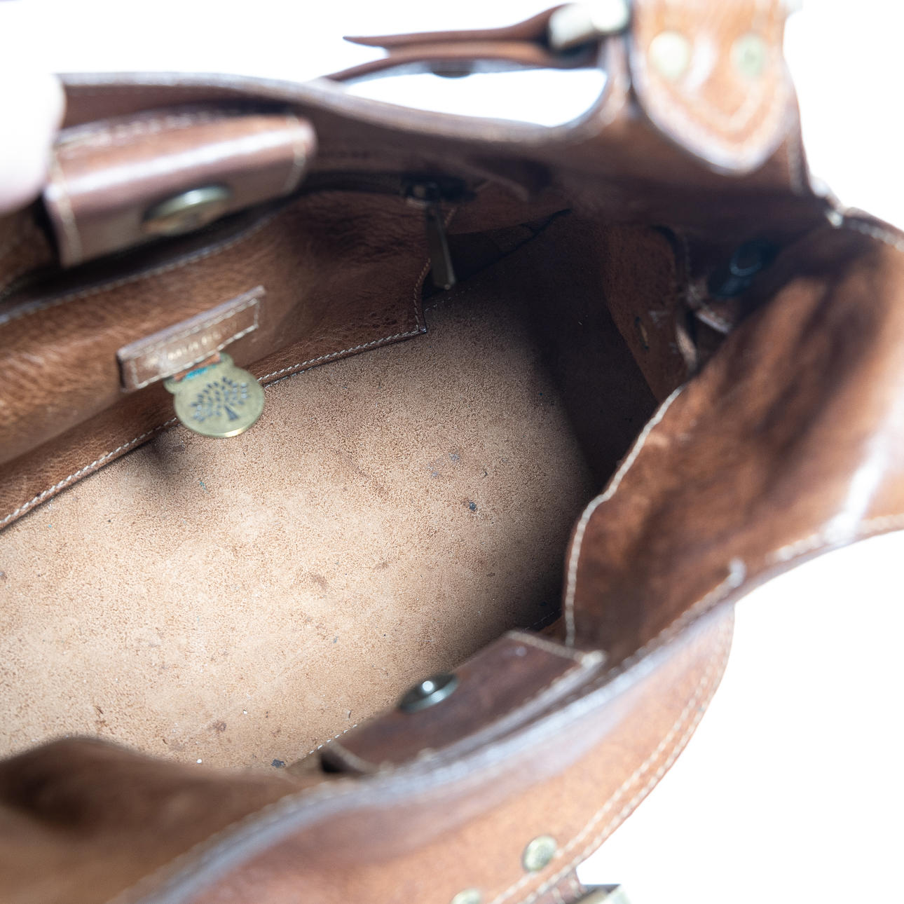 in brown 'Darwin Oak' core leather and details in brass-coloured metal. One compartment on the outside, inside a zippered side compartment. Marked MULBERRY and plaque marked. Approx. 32x27x12 cm.