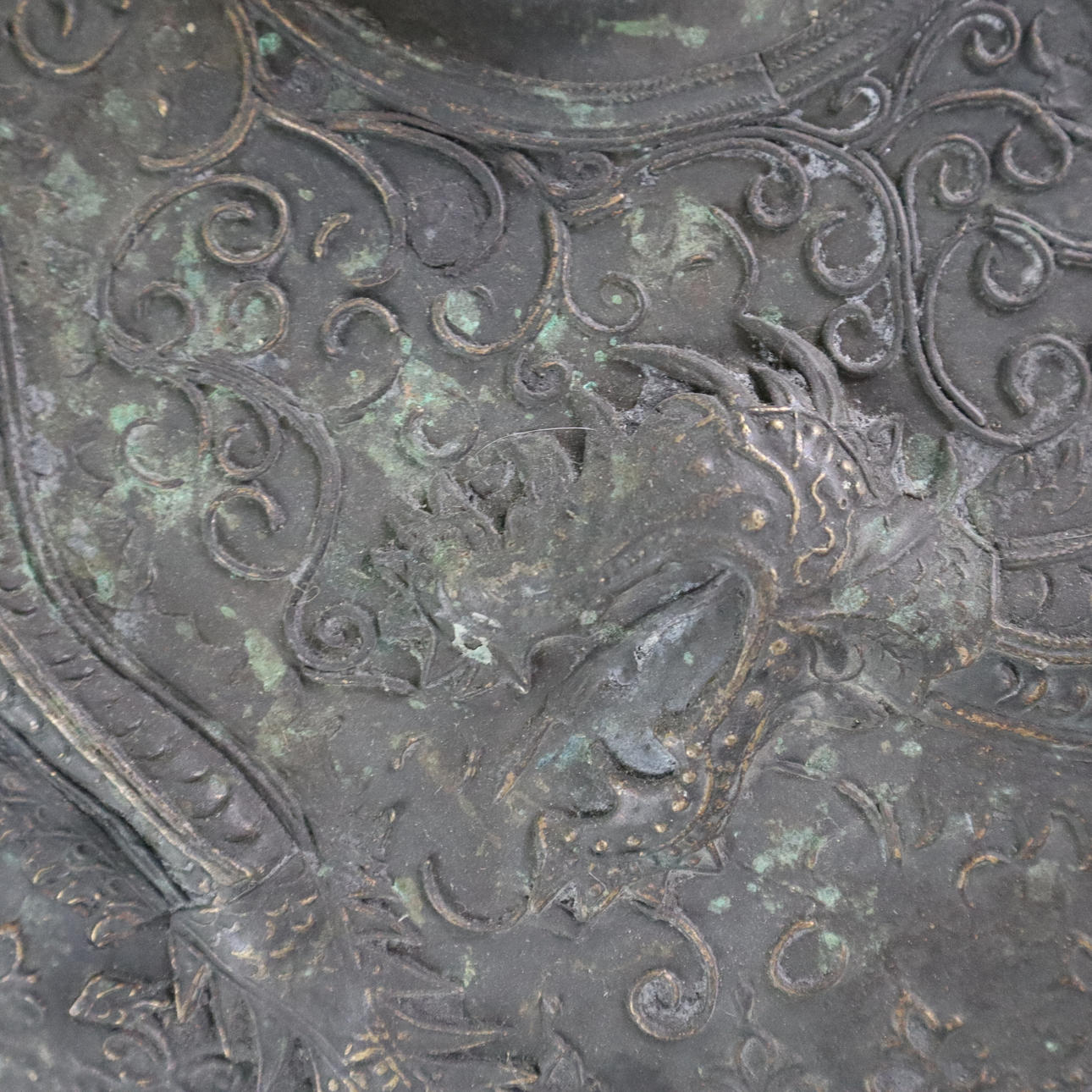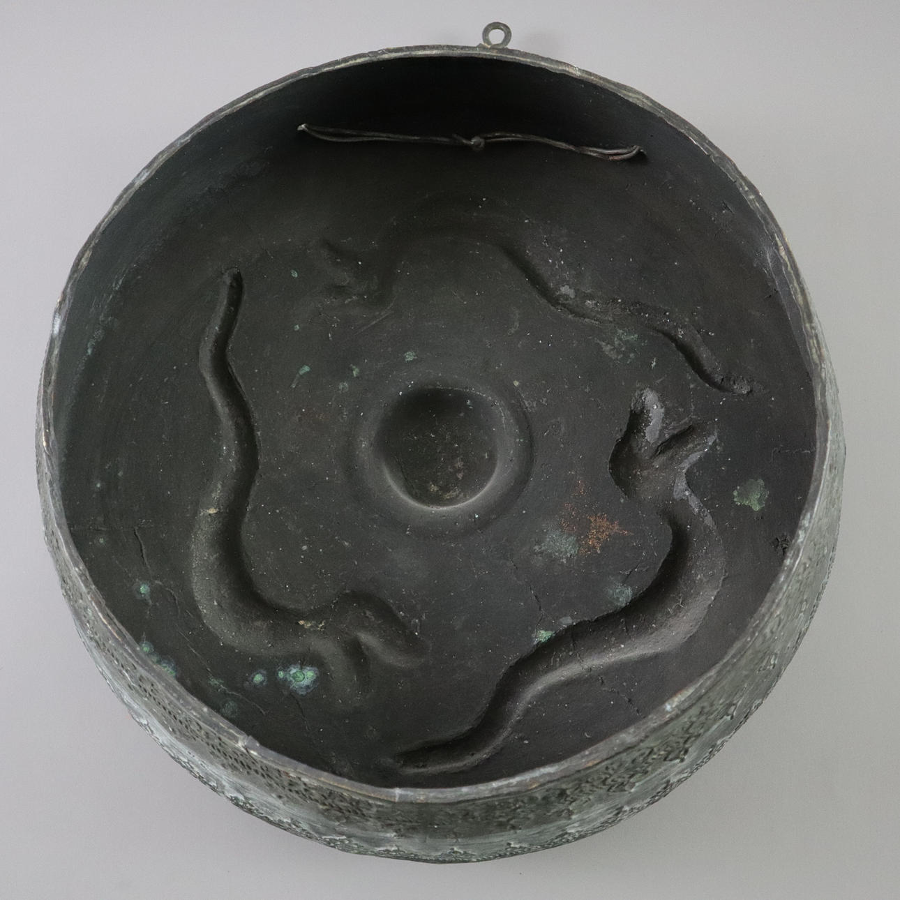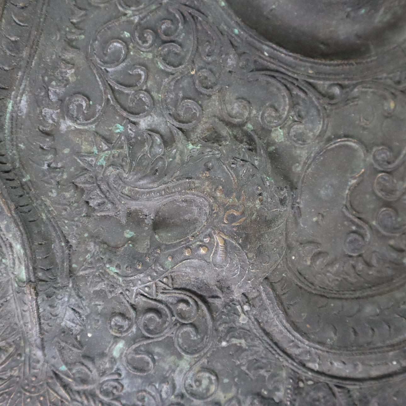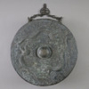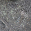 Massive bronze gong tawak - Borneo, dark patina, the gong disc has a prominent hump in its center, reliefs with dragon and tendril motifs, without clappers, chain suspension, diameter approx. 44 cm, weight approx. 7200 g.