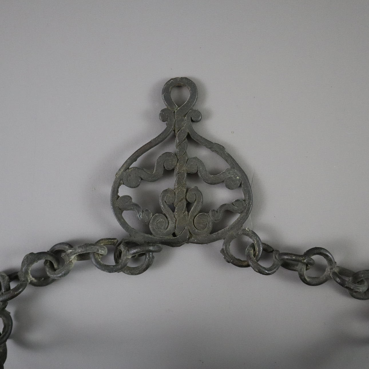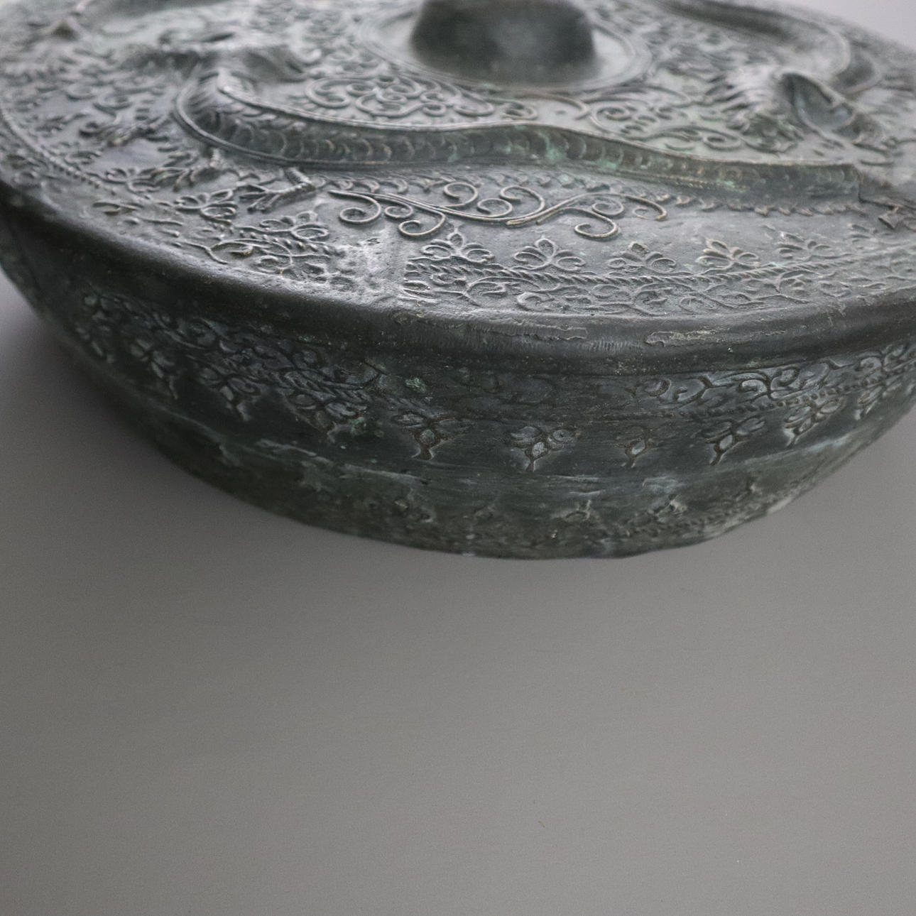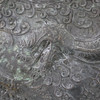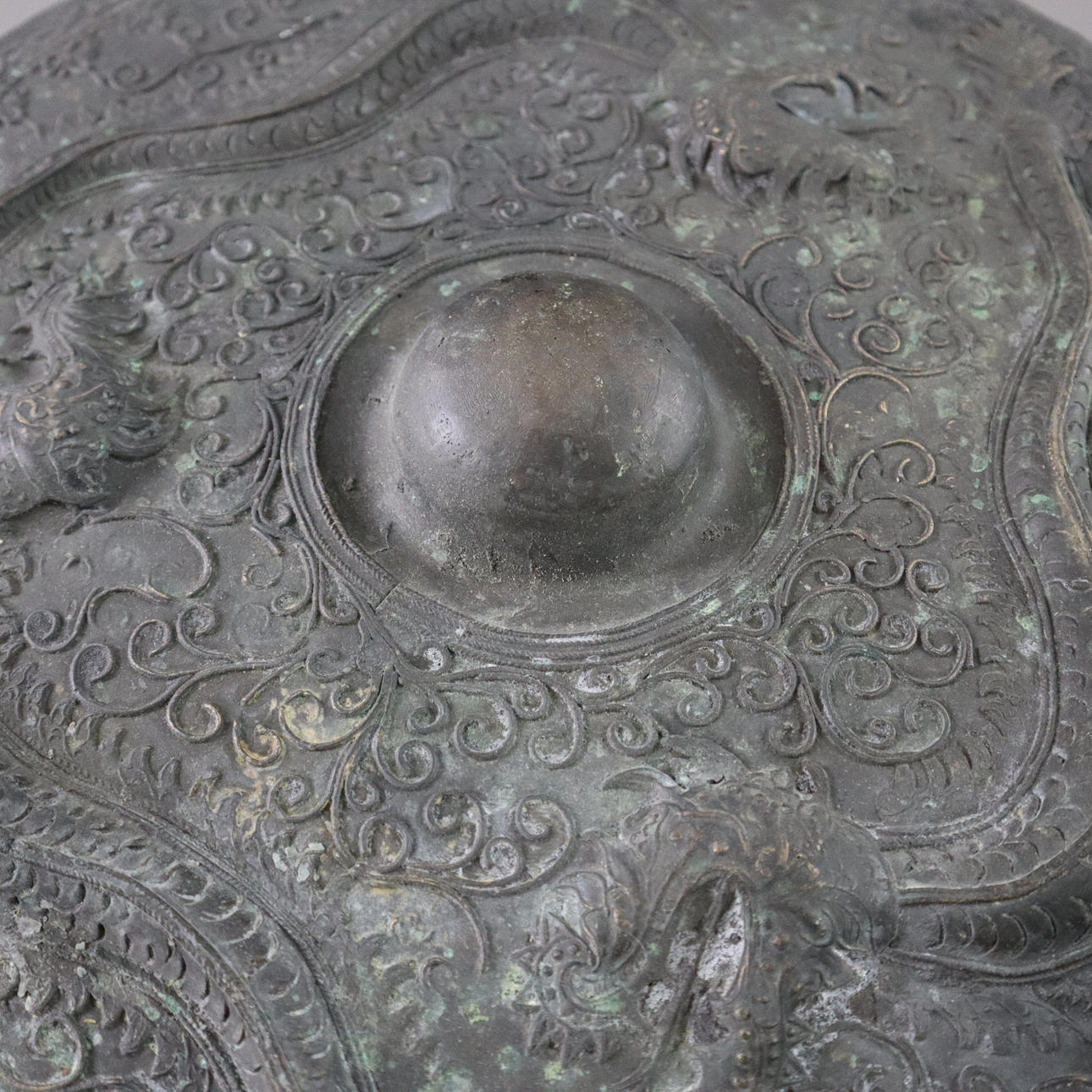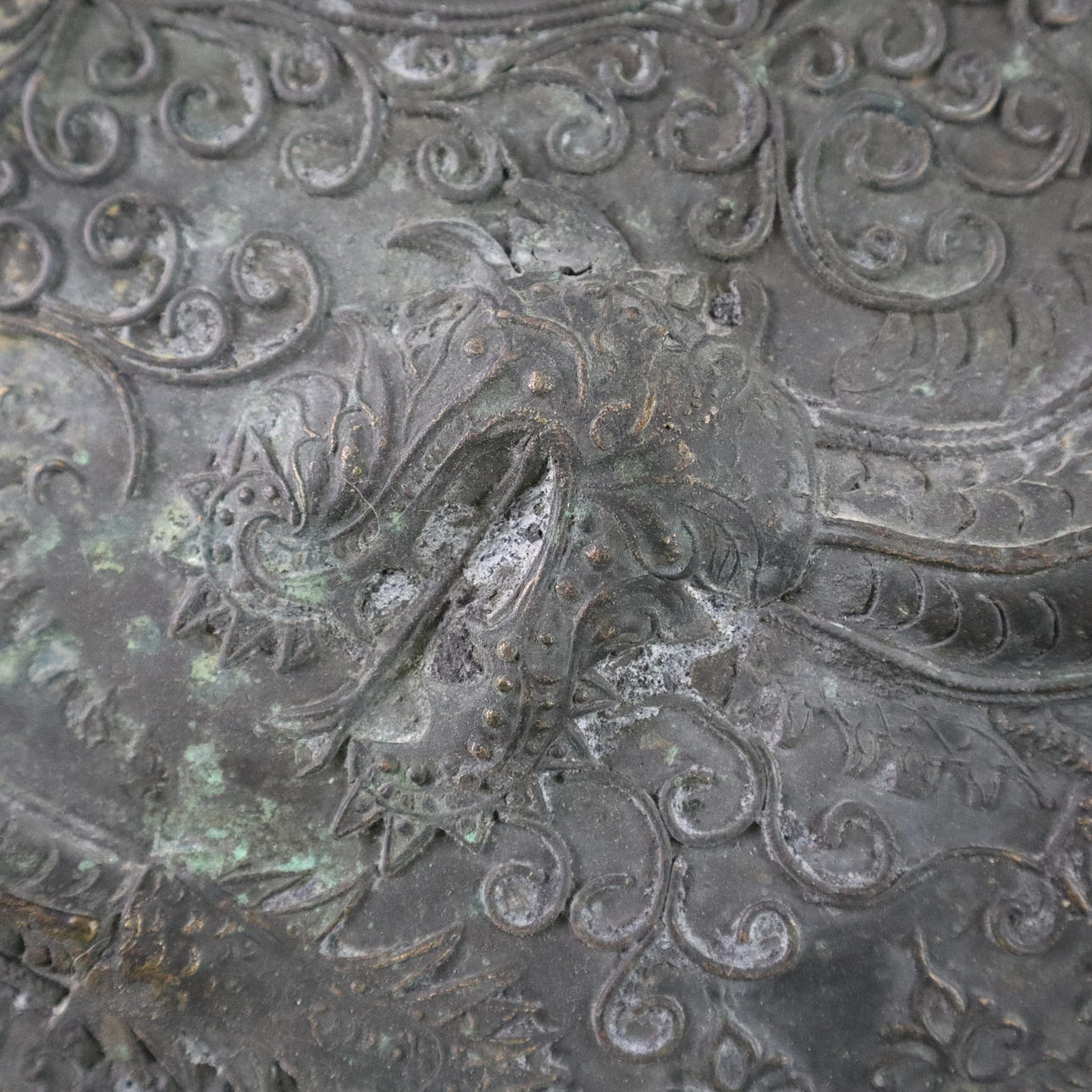 Massive bronze gong tawak - Borneo, dark patina, the gong disc has a prominent hump in its center, reliefs with dragon and tendril motifs, without clappers, chain suspension, diameter approx. 44 cm, weight approx. 7200 g.