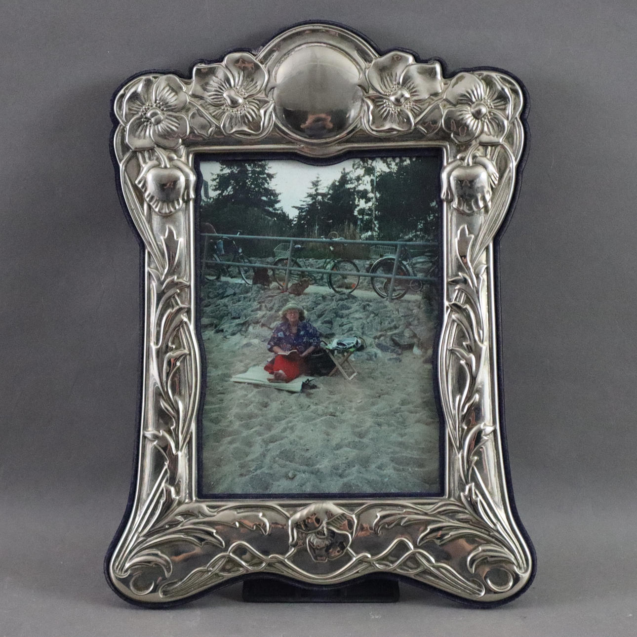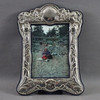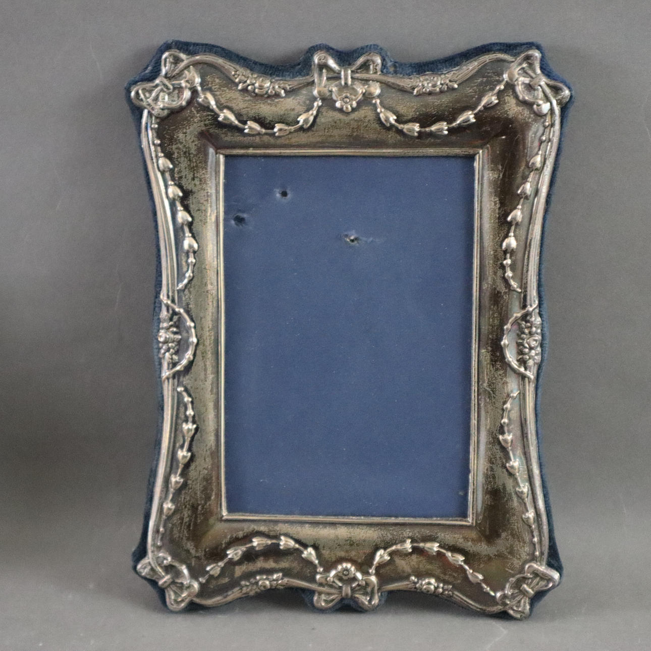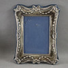 2x sterling silver frames, England, Londond/Birmingham, various shapes, both with flower garland and bow decoration, hallmarked, H.xB. 21 x 16 cm or 15.5 x 19.5 cm, 1x frame with floral relief decoration in Art Nouveau style, unstamped, H.xB. approx. 28.5 x 20 cm.