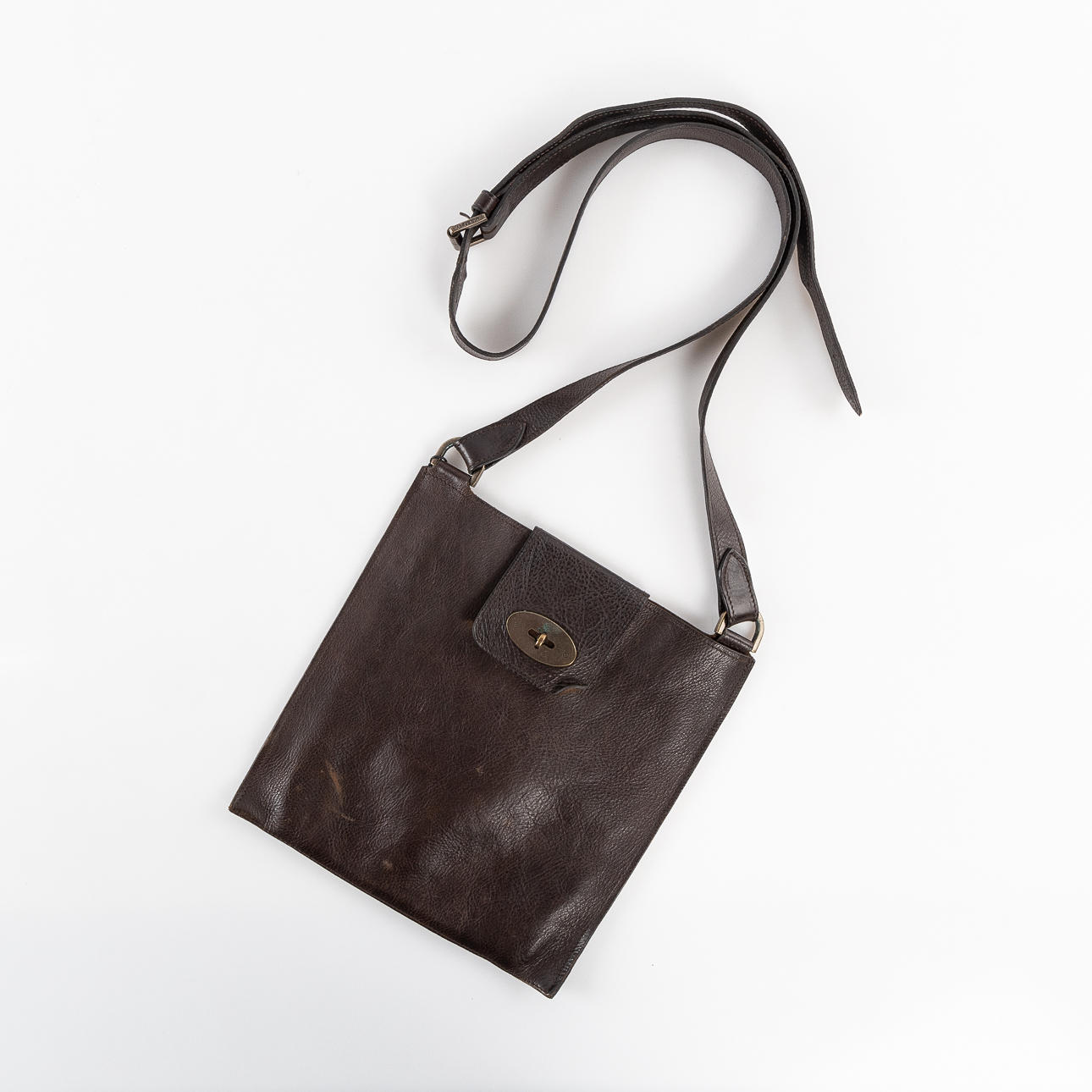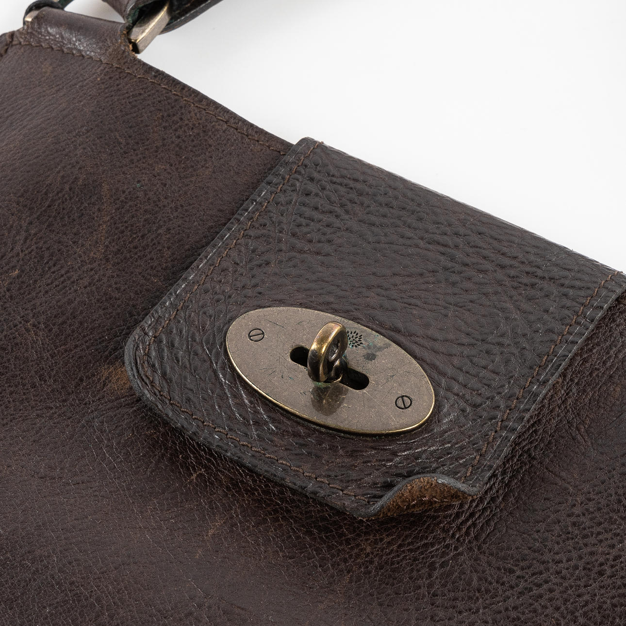 in brown leather with adjustable shoulder strap and brass metal flip clasp. Marked MULBERRY and plaque marked. Approx 26.5x26 cm.