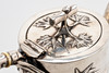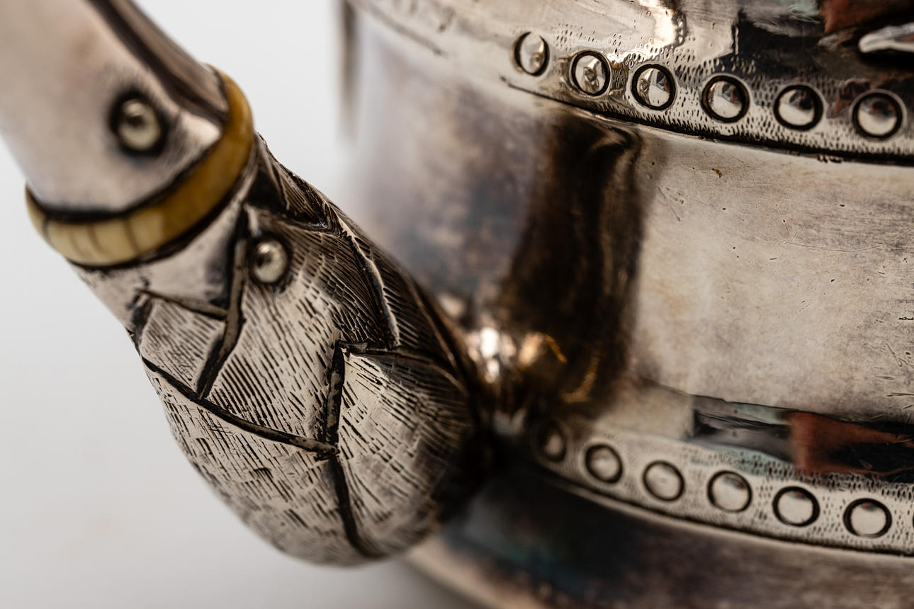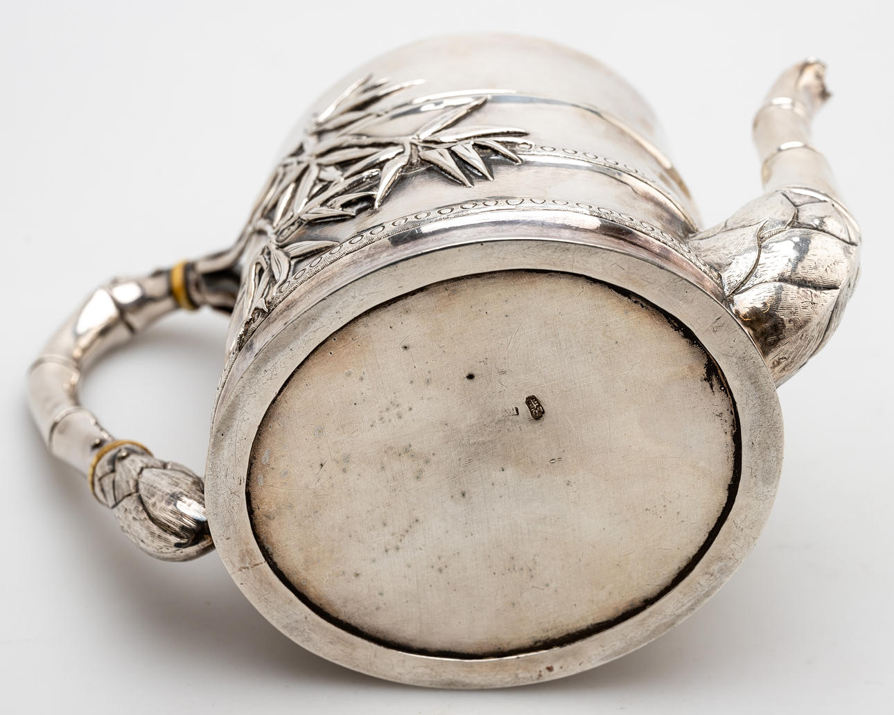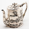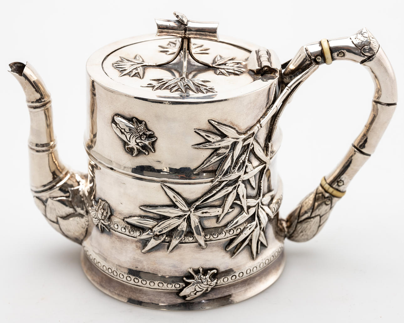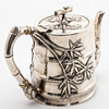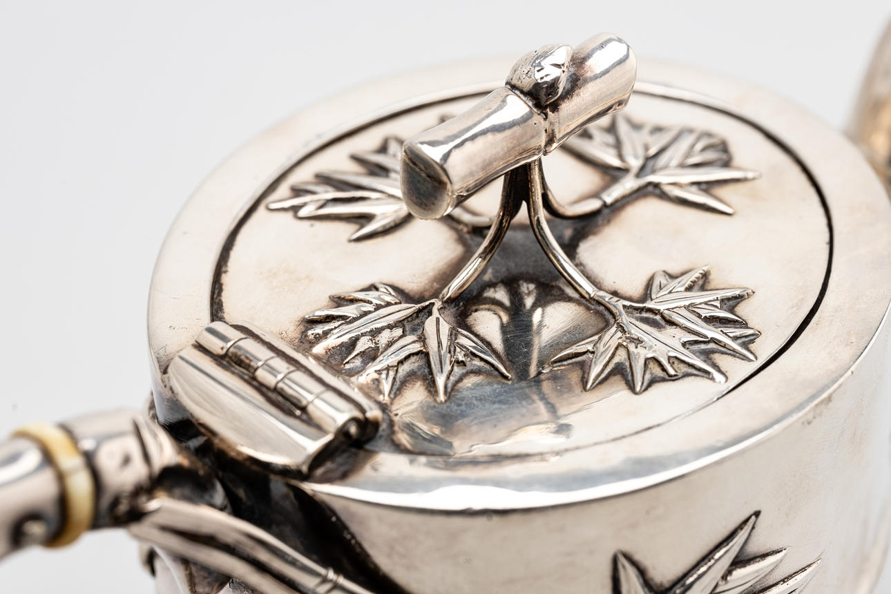Silver, pressed and engraved. Bamboo trompe l'oeil body, knob, handle and tube spout. Attached with relief bamboo leaves. Inscribed illegibly. HxWxD: approx. 14.5 x 20 x 10 cm, approx. 577g.