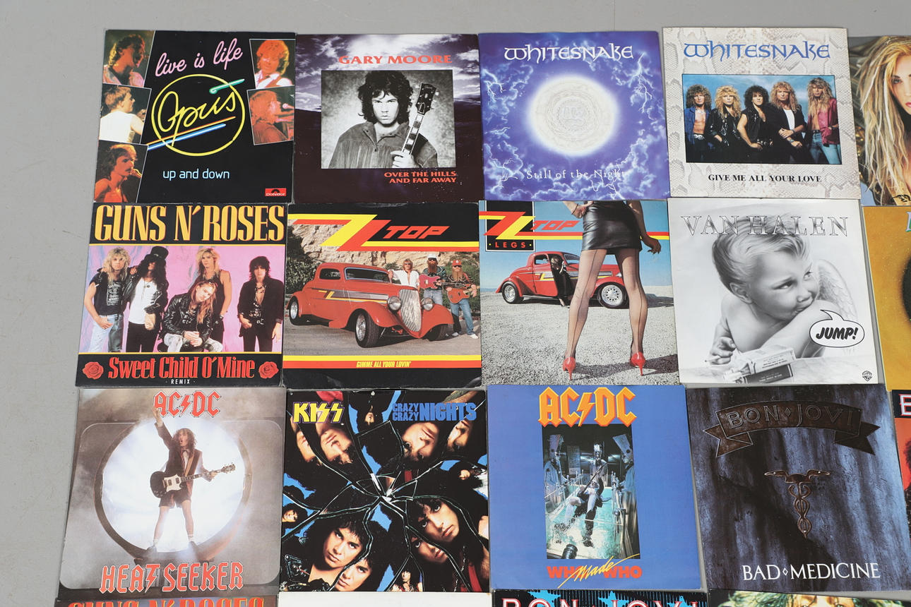 Various single records in their sleeves, including Bon Jovi, Guns N Roses, Poison, AC DC, Alice Cooper, Van Halen, Whitesnake, Aerosmith, Def Leppard, Iron Maiden etc.